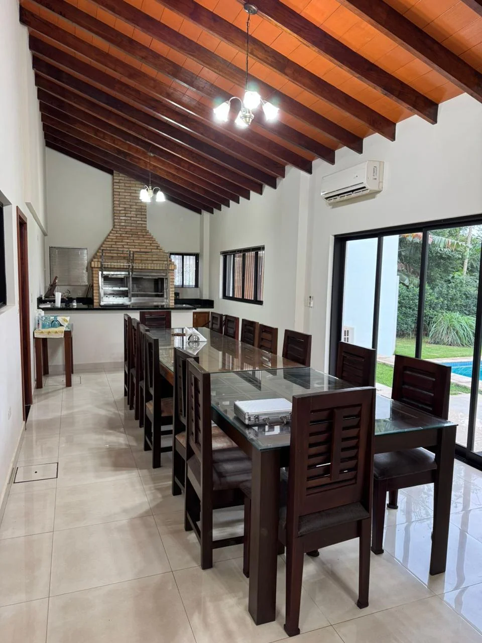 Planta baja: espacio para escritorio o gym, baño social, sala, cocina, quincho cerrado con sala de estar también. Lavandería y habitación de servicio con baño.
