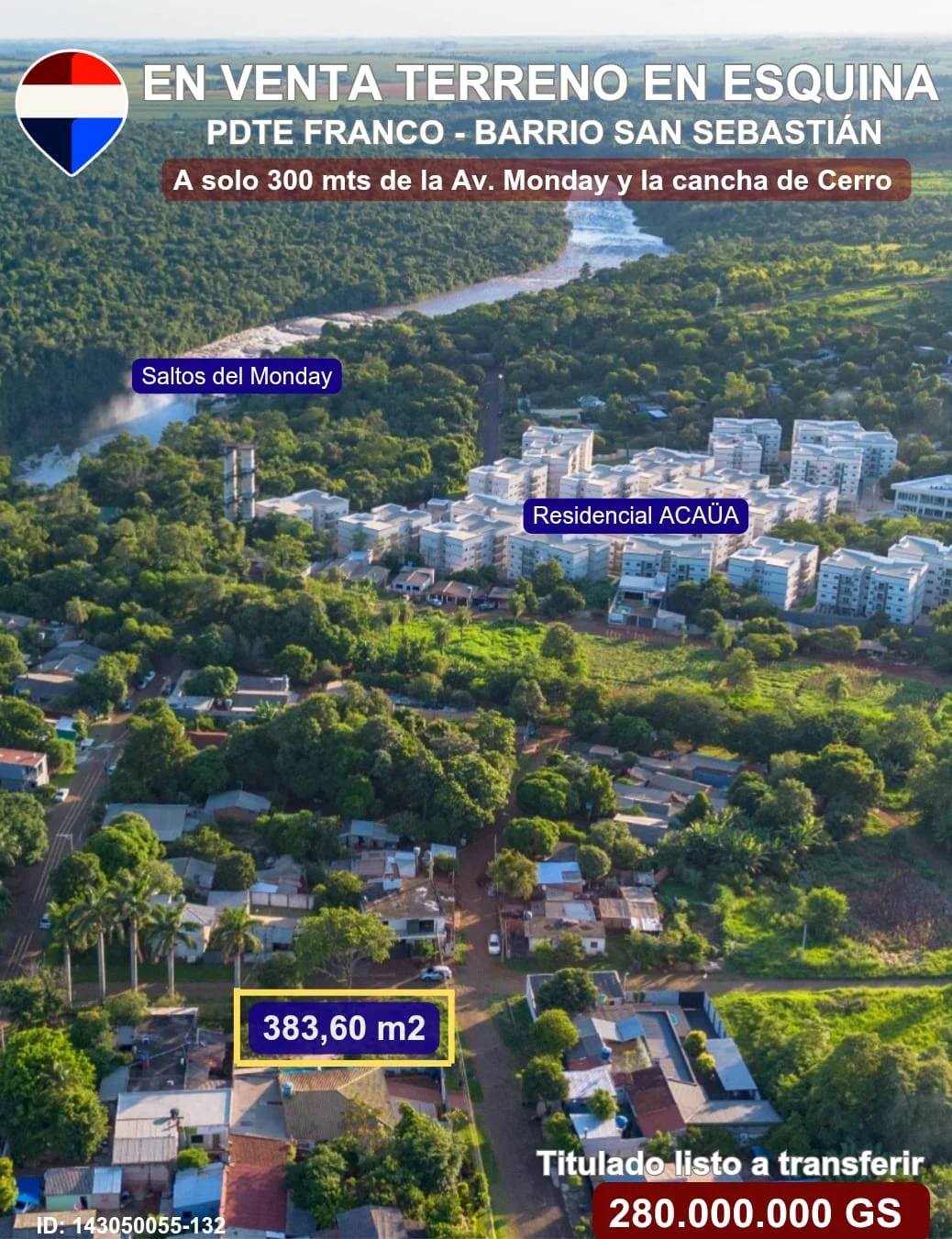 EN VENTA TERRENO EN ESQUINA - BARRIO SAN SEBASTIÁN, PDTE. FRANCO Excelente oportunidad en zona residencial, a 300 metros de la Av. Monday y el Club Cerro Porteño. Ideal para construir tu hogar o invertir en el desarrollo de dúplex o departamentos, en un entorno tranquilo y de alta proyección. Superficie: 383,60 m² Titulado, impuestos al día Listo para transferir Inversión: ***Gs ID: *** Ubicación: https://maps.app.goo.gl/bZaNEn6oYHsD8iTVA ? ¡No dejes pasar esta oportunidad! Contáctame