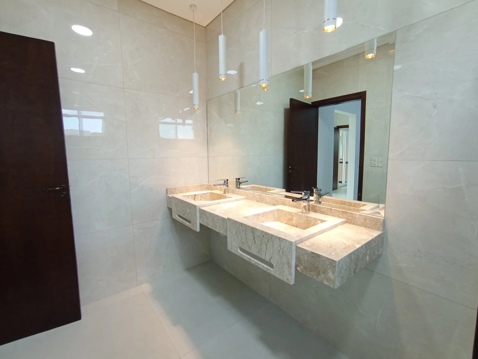 4 baños, 1 en la sala, 1 en el quincho, 1 baño compartido con bacha de mármol y mampara de ducha y 1 en suite con doble bacha de mármol y mampara de ducha