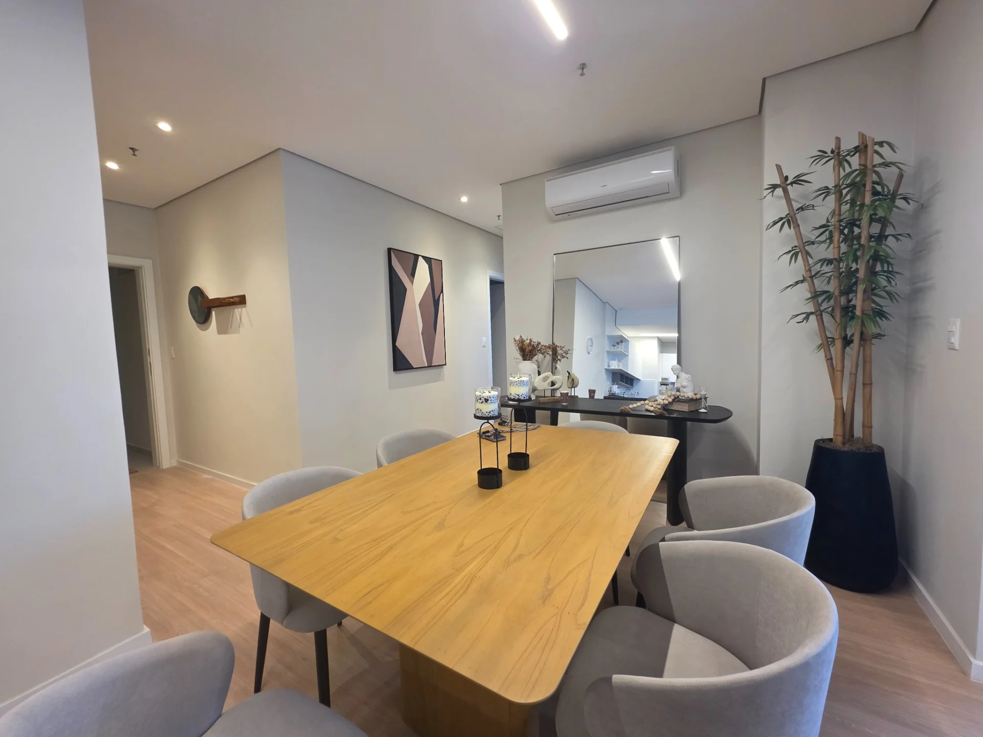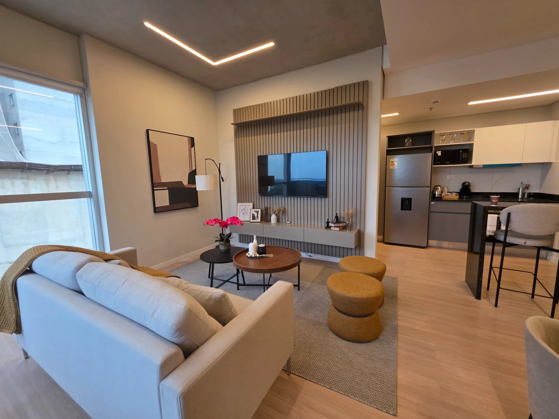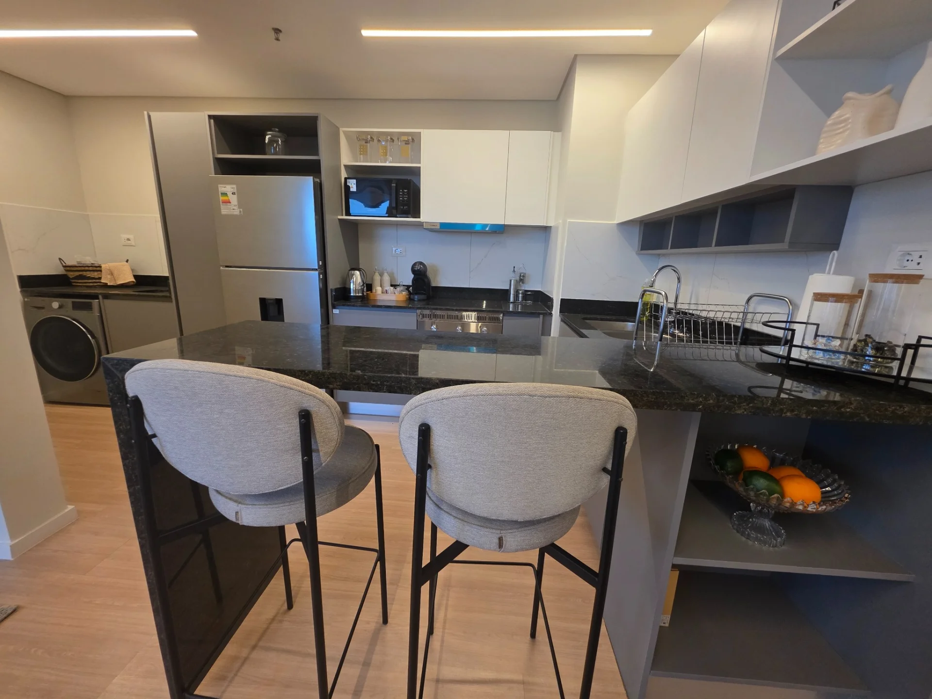El departamento cuenta con dos dormitorios equipados con placares, uno de ellos en suite para su máxima privacidad. La cocina semi-integrada está completamente equipada con anafe, horno, extractor, lavarropas, heladera y microondas, facilitando su día a día. El amplio living comedor es ideal para el entretenimiento, con un cómodo sofá, televisor y un elegante juego de comedor. Además, dispone de un baño social que también sirve a la segunda habitación y un balcón para disfrutar de las vistas. Todos los ambientes están climatizados con aires acondicionados para su confort. Incluye una cochera.