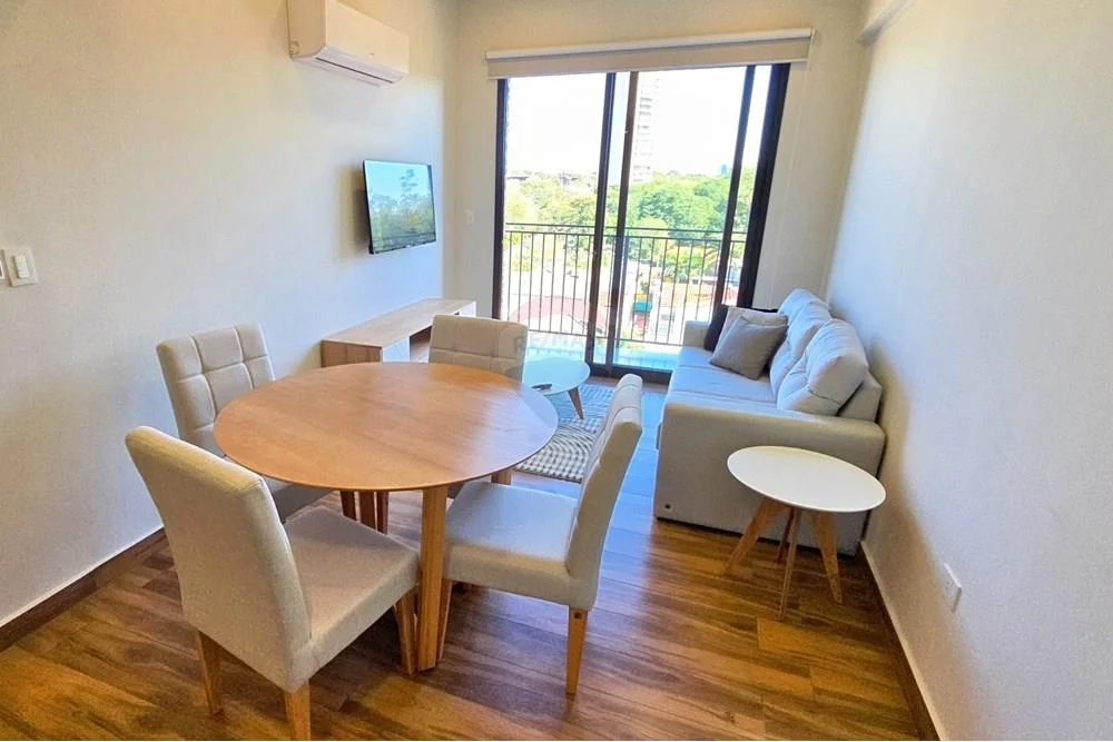 Departamento amoblado en alquiler en Edificio Piacenza. Incluye dormitorio, baño, sala, cocina, comedor, balcón y cochera. Amenidades: piscina, gimnasio, laundry, quincho climatizado.