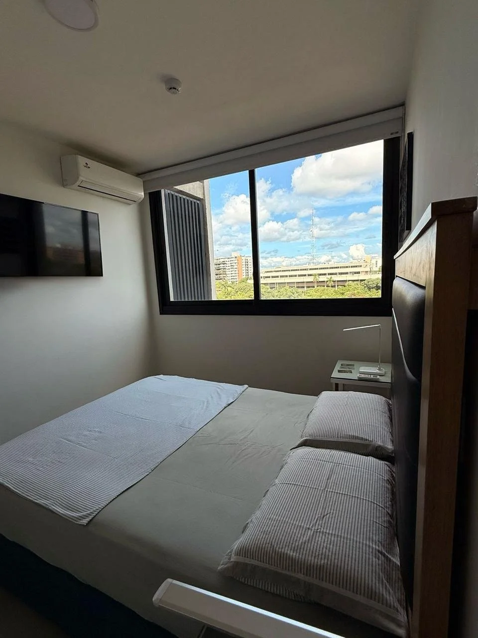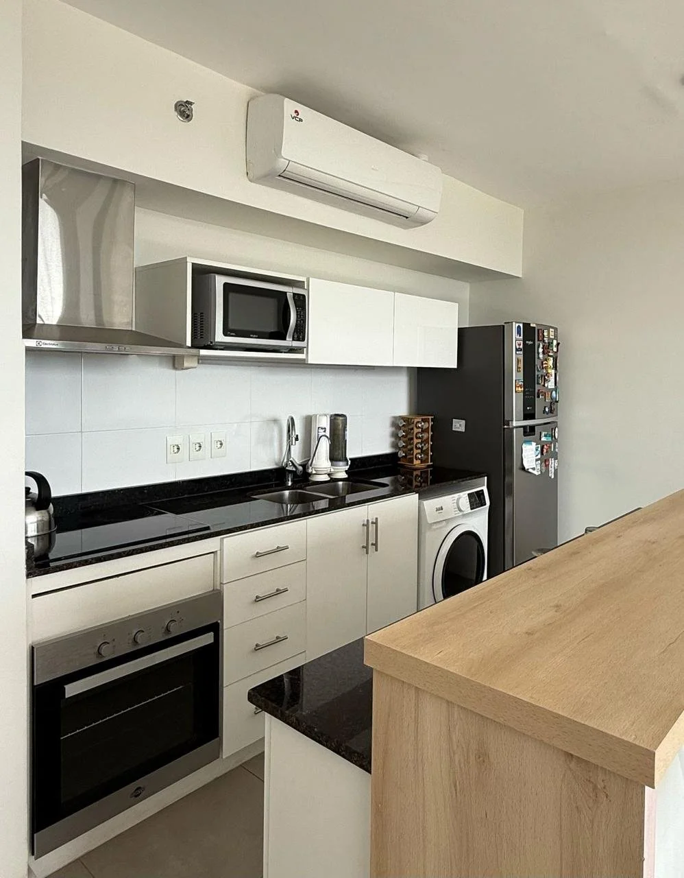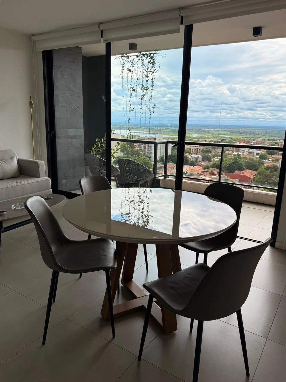 Sala, comedor, balcon con parrilla al frente con vista a la bahía de Asunción, Cocina con barra desayunador, A.A. en todos los ambientes, anafe y campana de acero inoxidable.