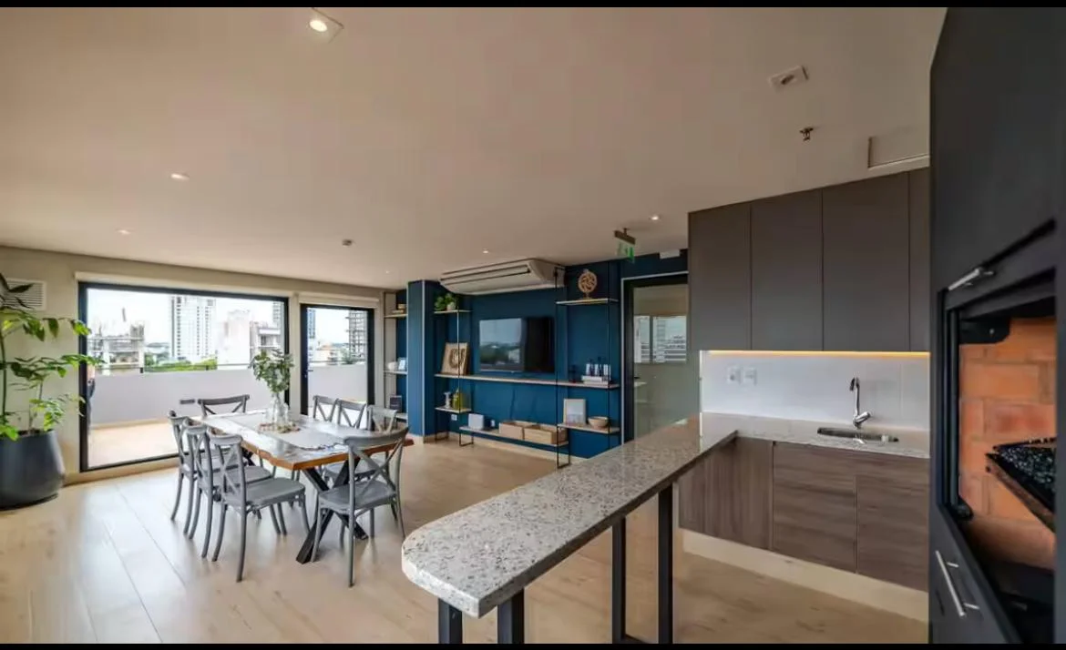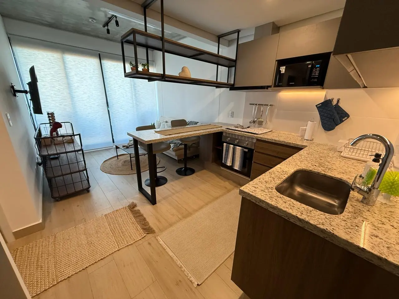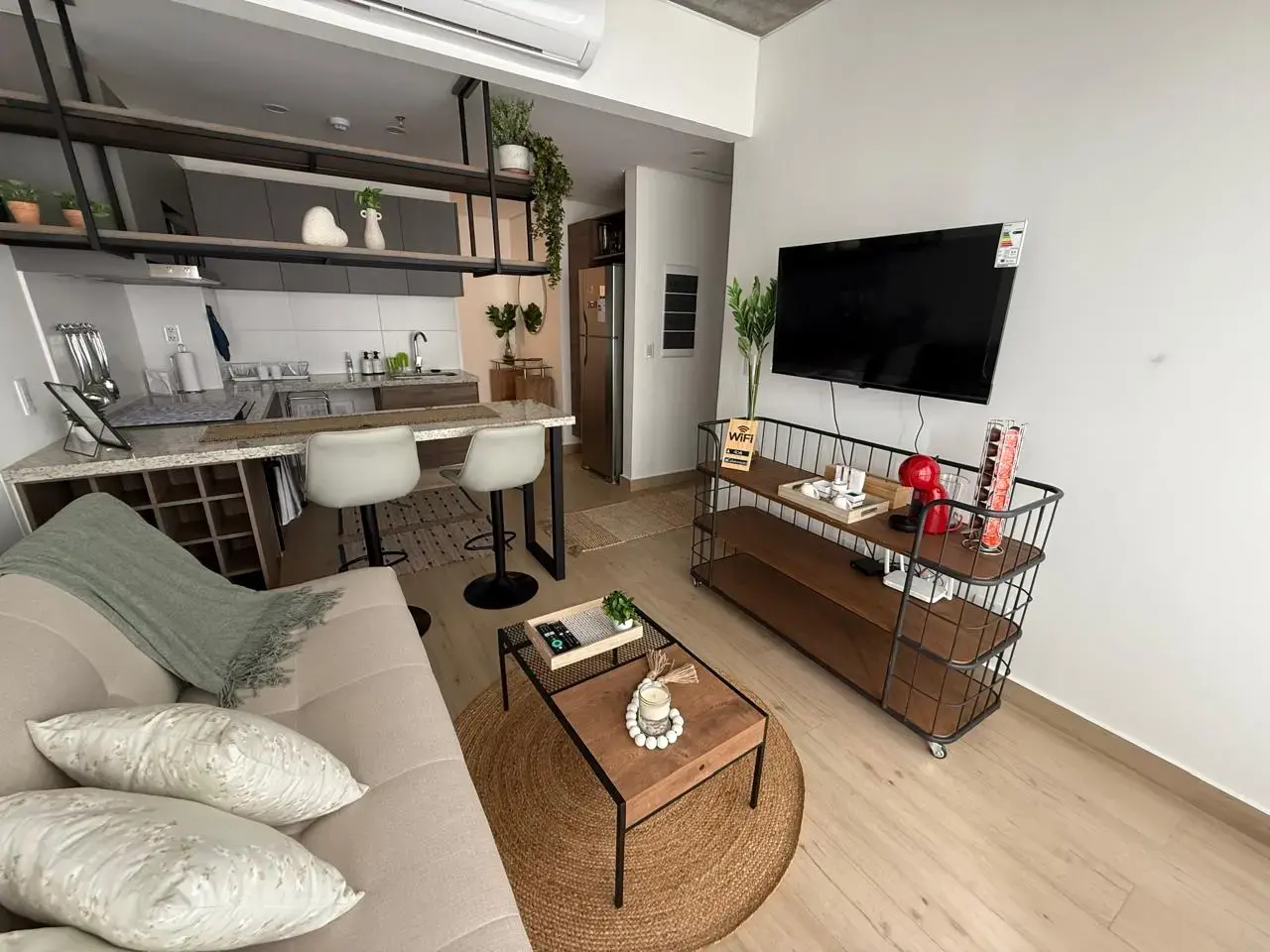 - Sala con sofá cama y cocina integradas