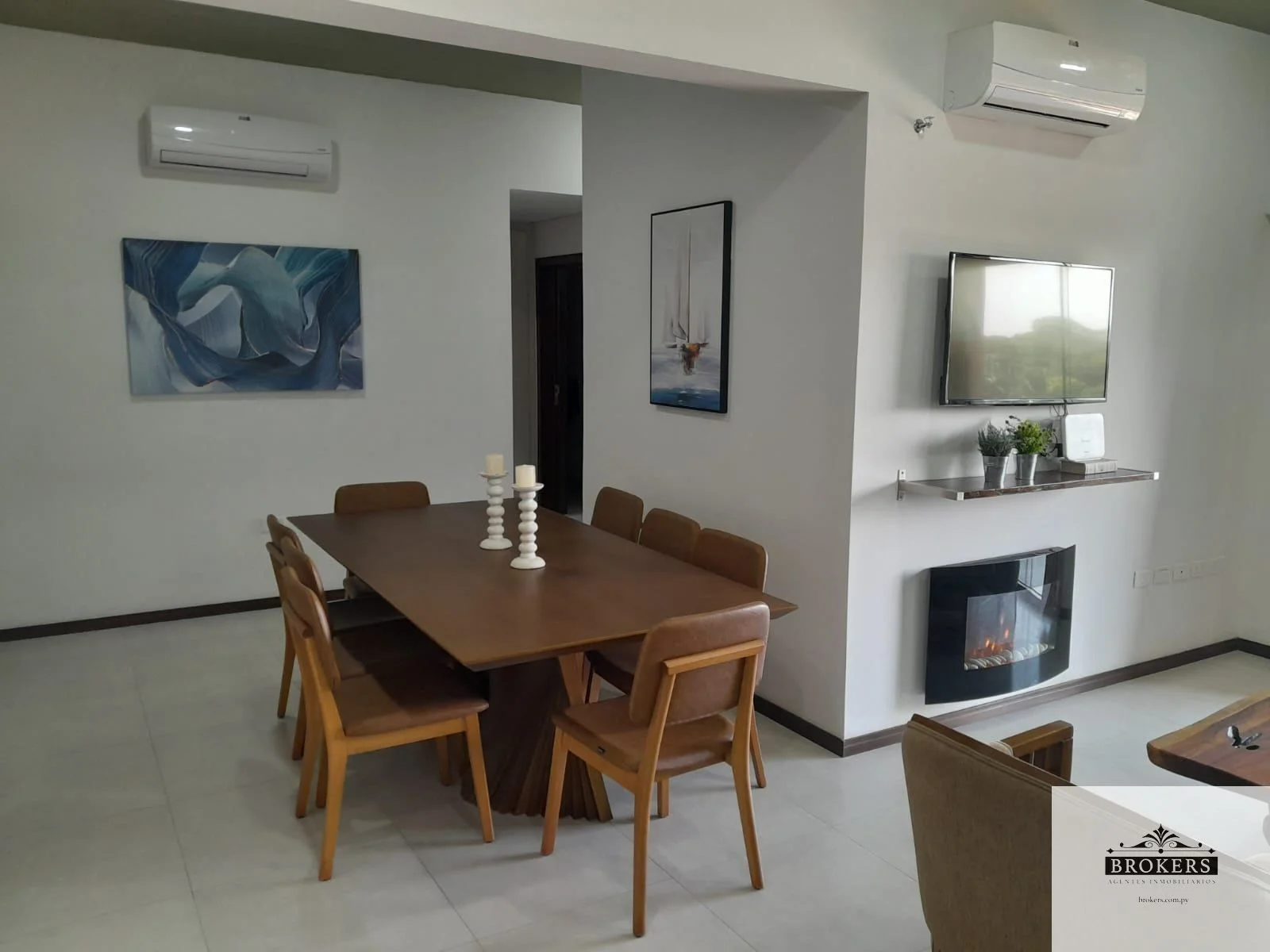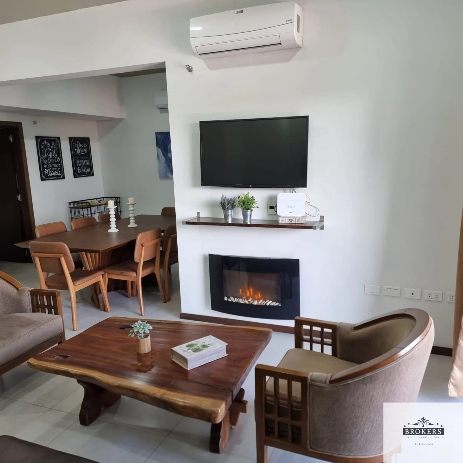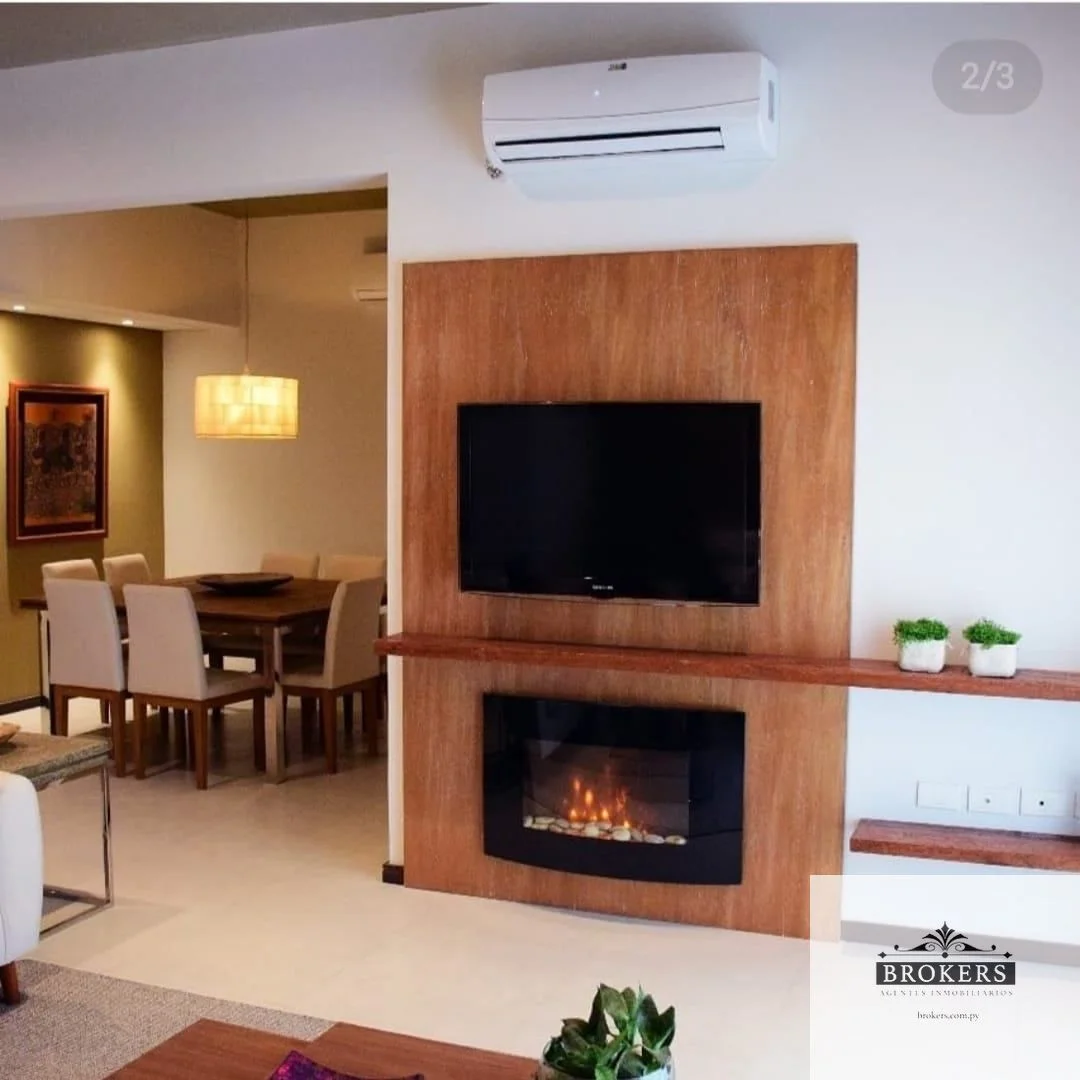 Sala comedor con chimenea eléctrica, balcón con parrilla,