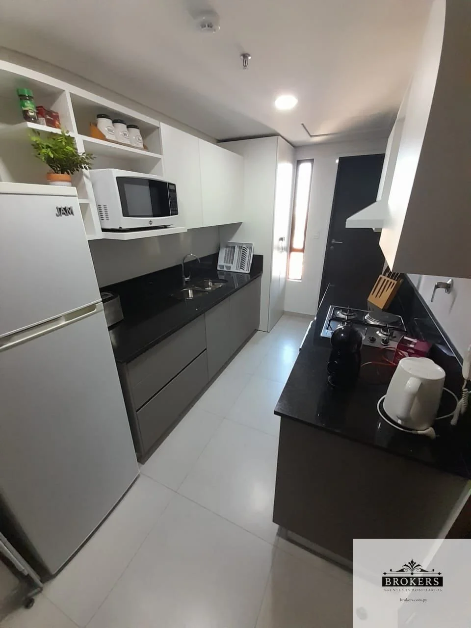 Cocina amoblada con electrodomésticos, Heladera, anafe a gas, horno eléctrico, lavarropas y secarropas-