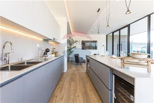 Amplia cocina semi integrada con desayunador, equipada con mesada de cosentino, anafe, purificador, horno, lavavajillas, heladera.