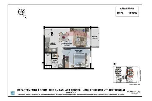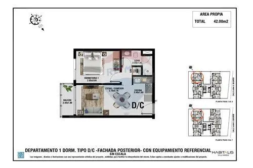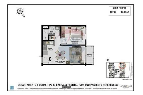 1 dormitorio, 42 m² propios, desde: 73.500 USD.