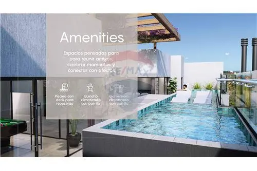 Balcón con parrilla en todas las unidades, Muebles de cocina con mesada de granito y placares incluidos, purificador y anafe, Mampara en box de ducha, AA en todos los ambientes, estacionamiento para bicicletas, Ascensor, Area de servicio para personal domestico con lockers, Seguridad 24 horas, Circuito cerrado y portero eléctrico, generador para áreas comunes, piscina con deck para reposeras, Gameroom climatizado con parrilla y quincho climatizado en terraza.