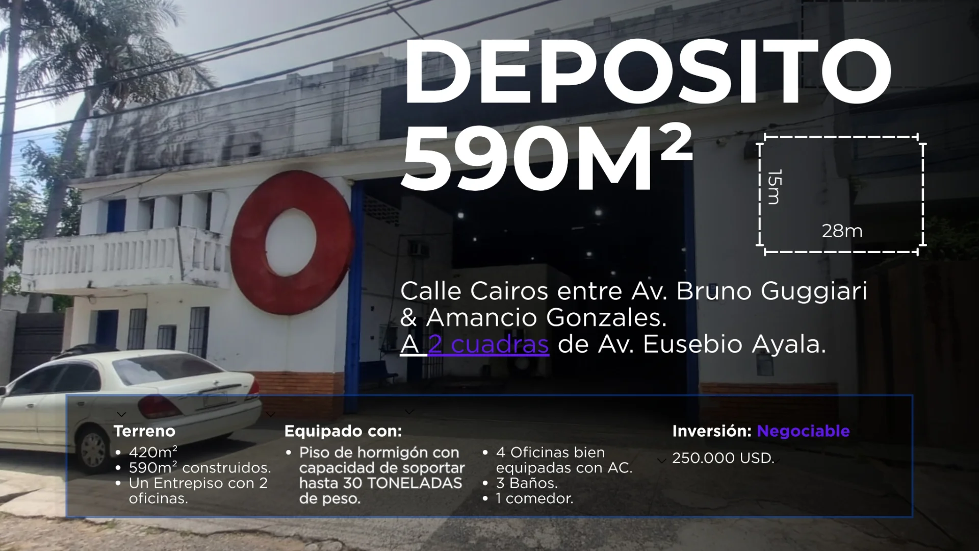 Spacious warehouse in the Vista Alegre neighborhood, located just 19 blocks from Mercado 4 and only 2 blocks from Eusebio Ayala Avenue.