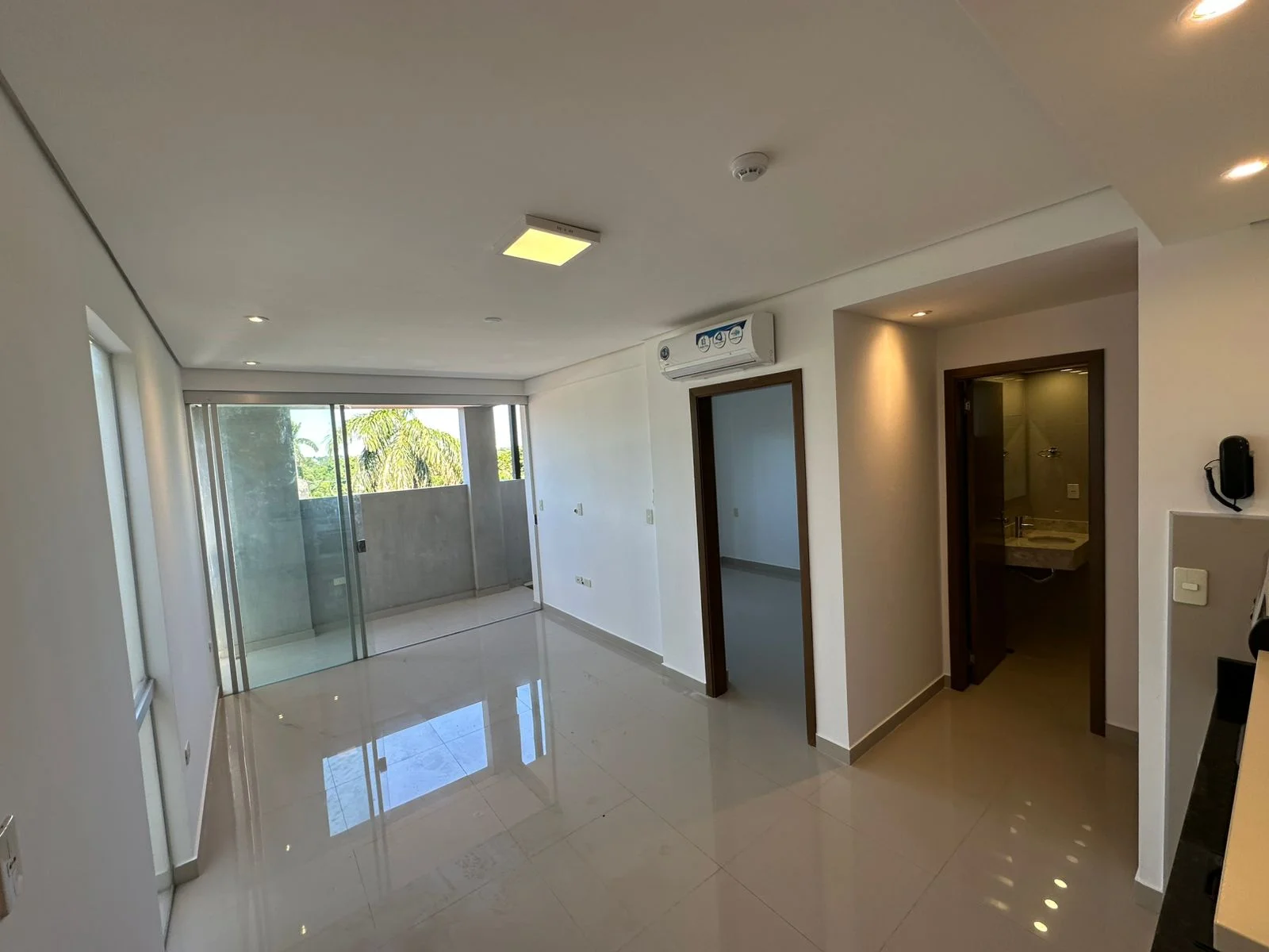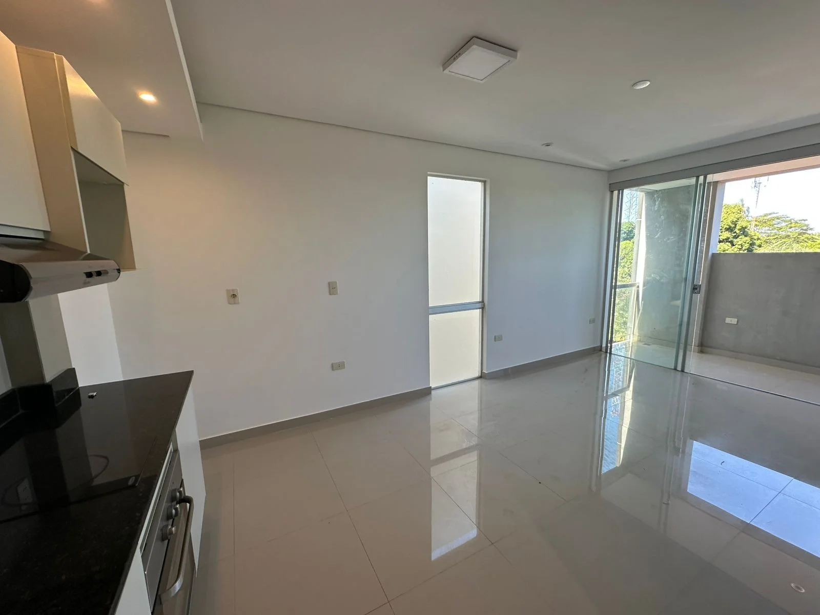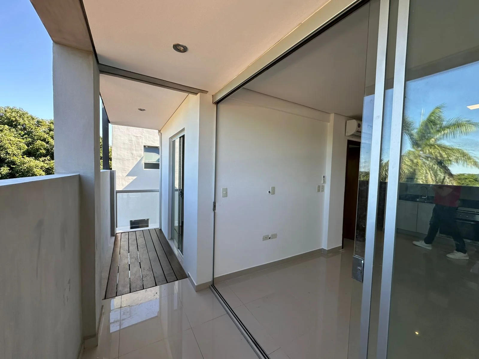 Balcón amplio que abarca sala y dormitorio con sus respectivos ventanales de acceso