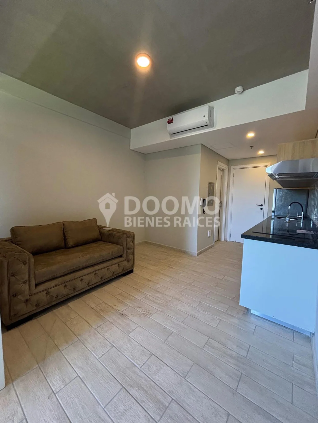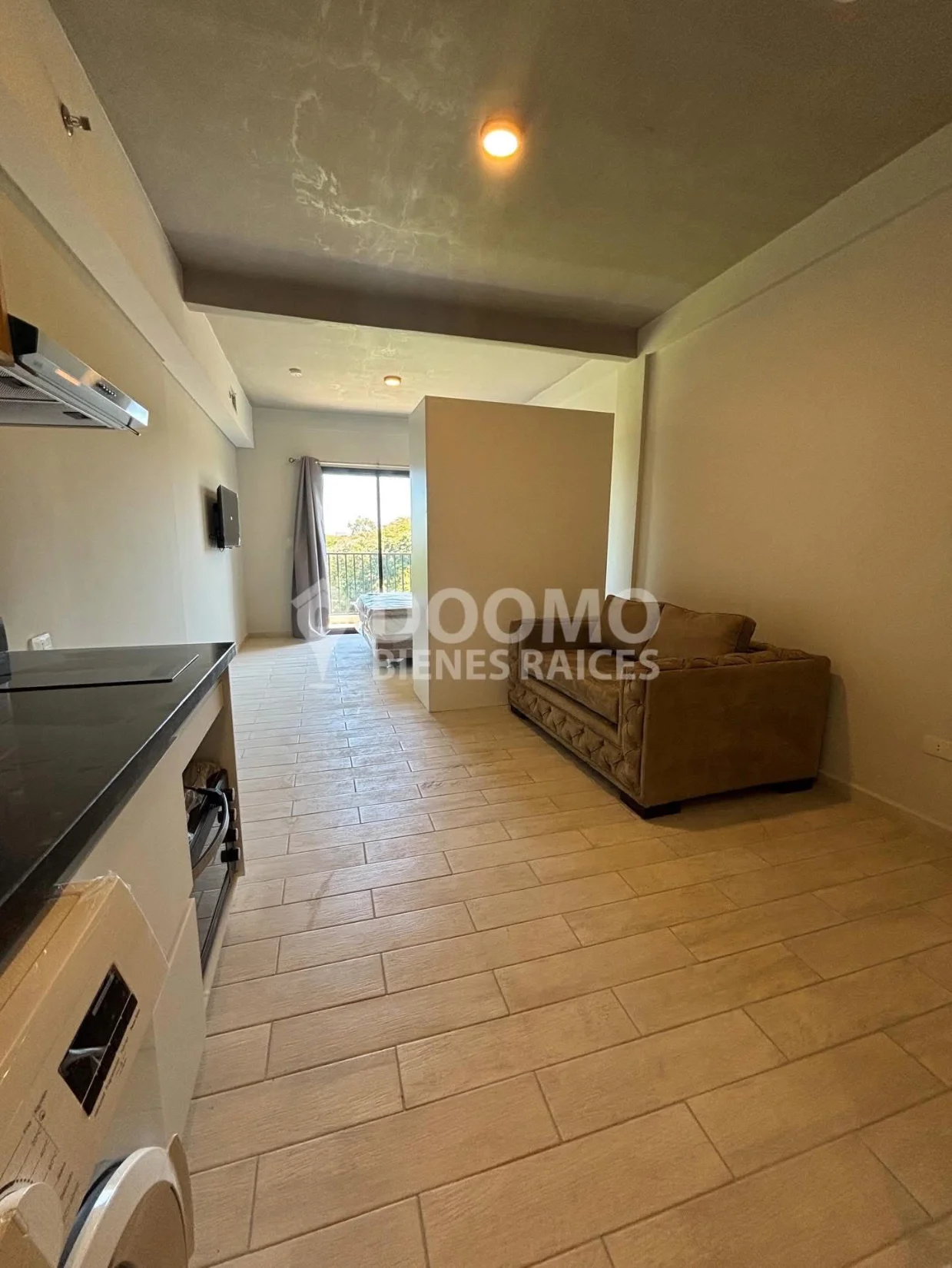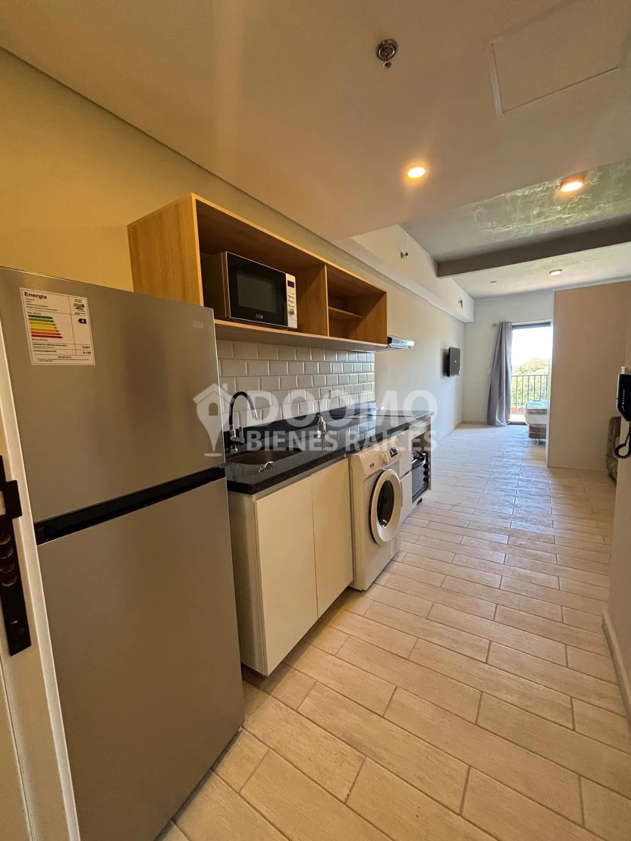 Cocina abierta equipada con muebles de cocina, anafe eléctrico de dos hornallas, purificador de aire, heladera , microondas, horno eléctrico,lavadora
