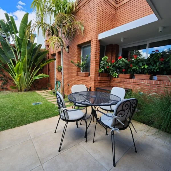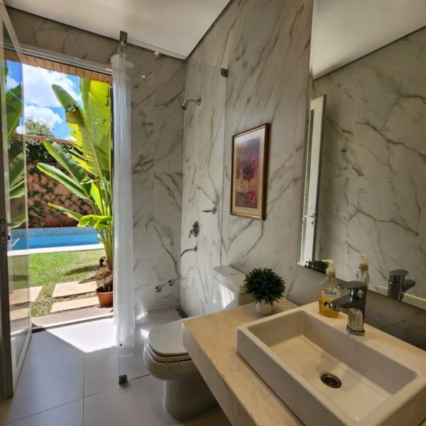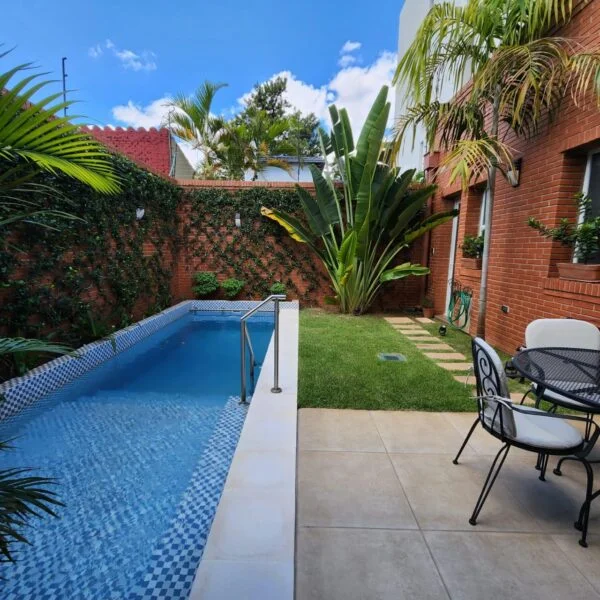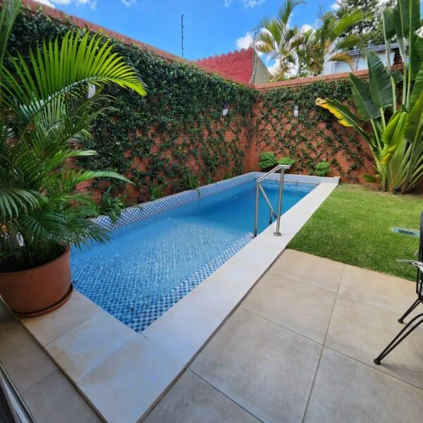 Jardín con piscina con baño con acceso a la casa.