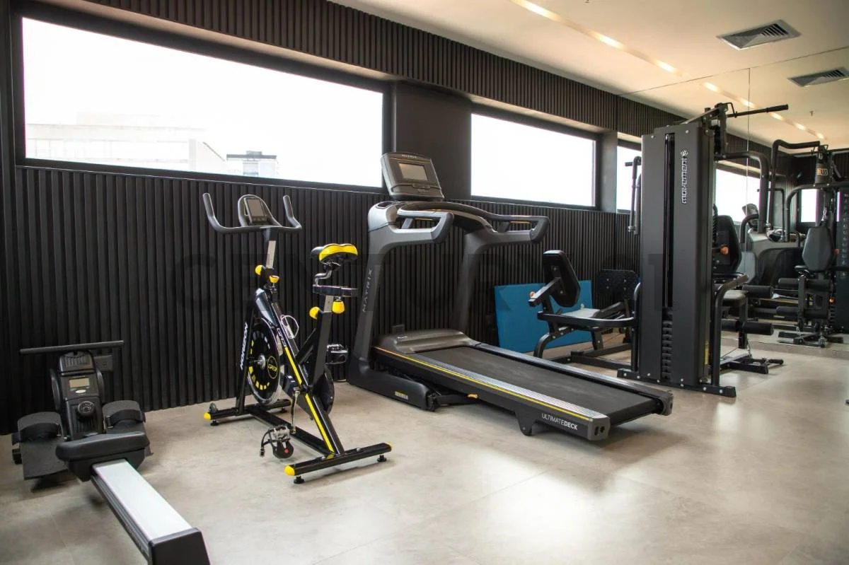 Great amenities including BBQ area, swimming pool, grill, gym, and sauna.