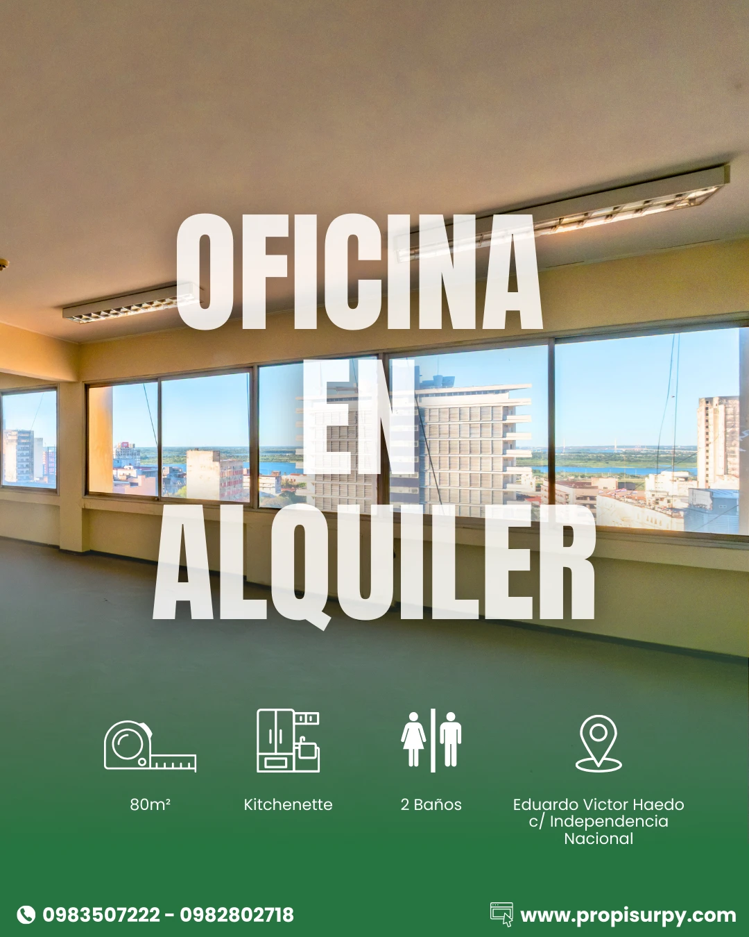 Oficina en alquiler en Edificio Benton ?Eduardo Víctor Haedo c/ Independencia Nacional Espacio de 80 m² ? Distribución : - 2 baños - 1 Kitchenette - 1 Oficina - Opción de estacionamiento a 1 cuadra ?Alquiler: Gs. *** + IVA Estacionamiento: 250.000 ? Ubicación estratégica: https://maps.app.goo.gl/Tje7GRQWAvkuDS6VA ¡Contactanos hoy al *** - ***para más y agendar tu visitas!