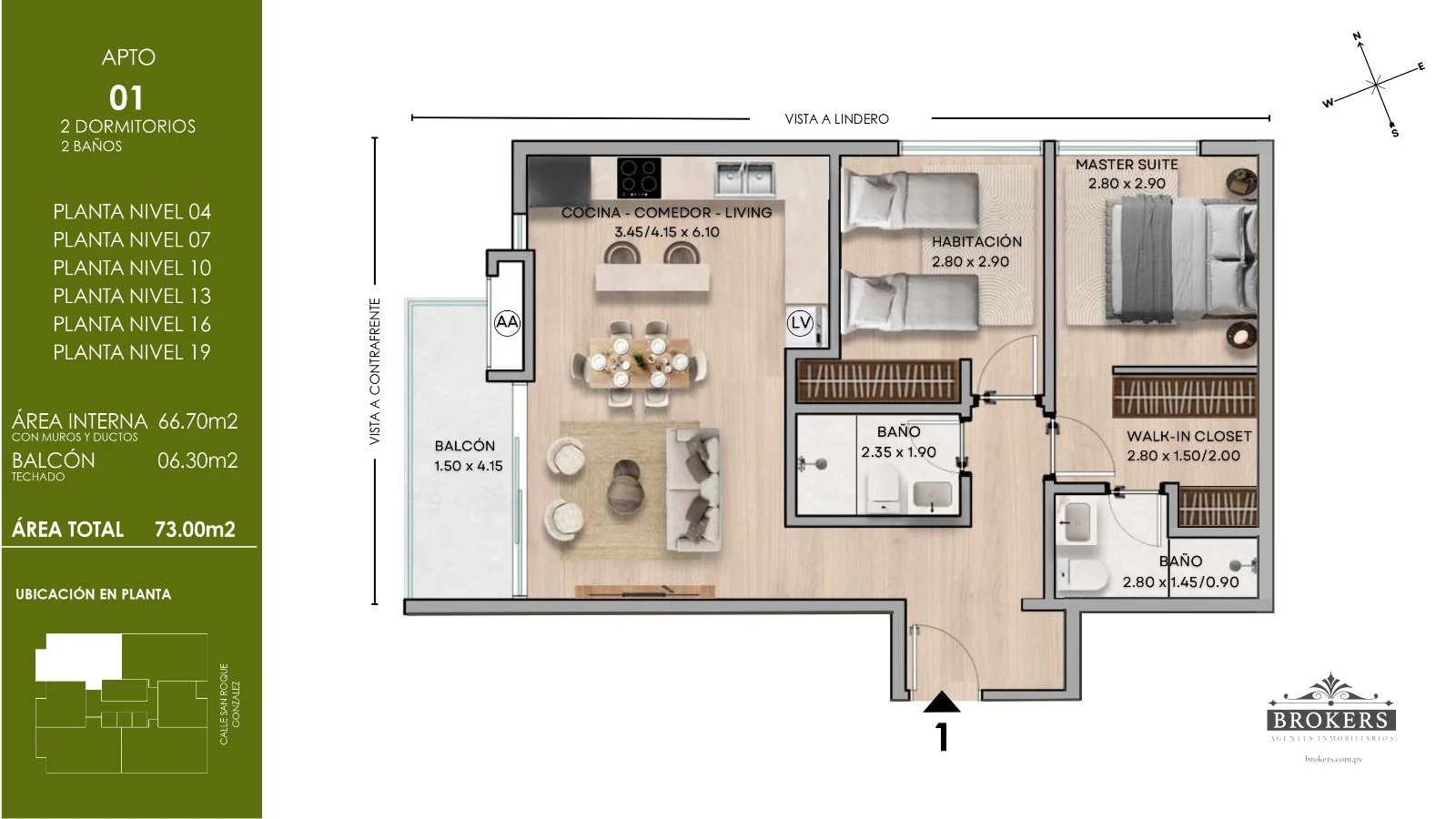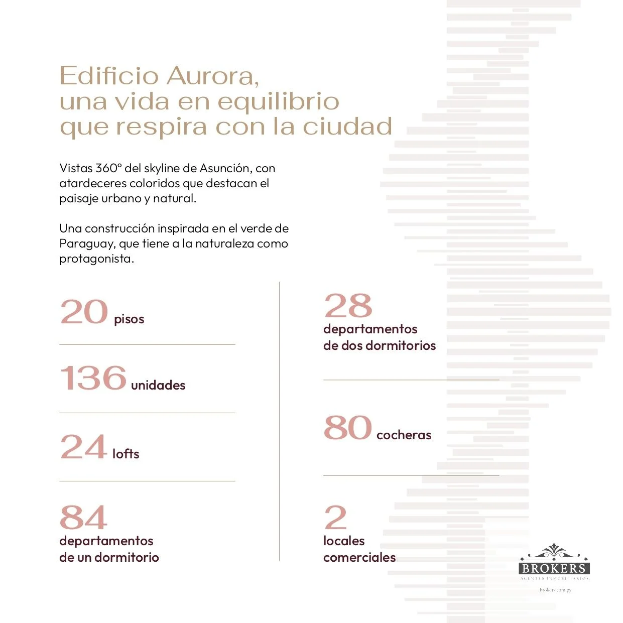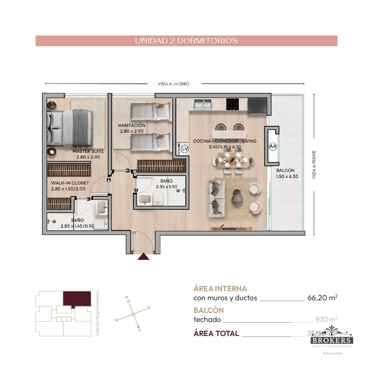 El Edificio Aurora presenta una oportunidad única de inversión con un departamento de 75,30 m² que redefine el concepto de calidad de vida en el corazón de la Recoleta, Asunción. Esta unidad destaca por su master suite, que incluye un walk-in closet y un baño en suite, además de una segunda habitación completa y un baño social. La cocina, el comedor y el living se integran en un diseño de planta abierta con aberturas de piso a techo, brindando una luminosidad excepcional y una conexión fluida con el balcón de 9,10 m², que ofrece vistas frontales.
