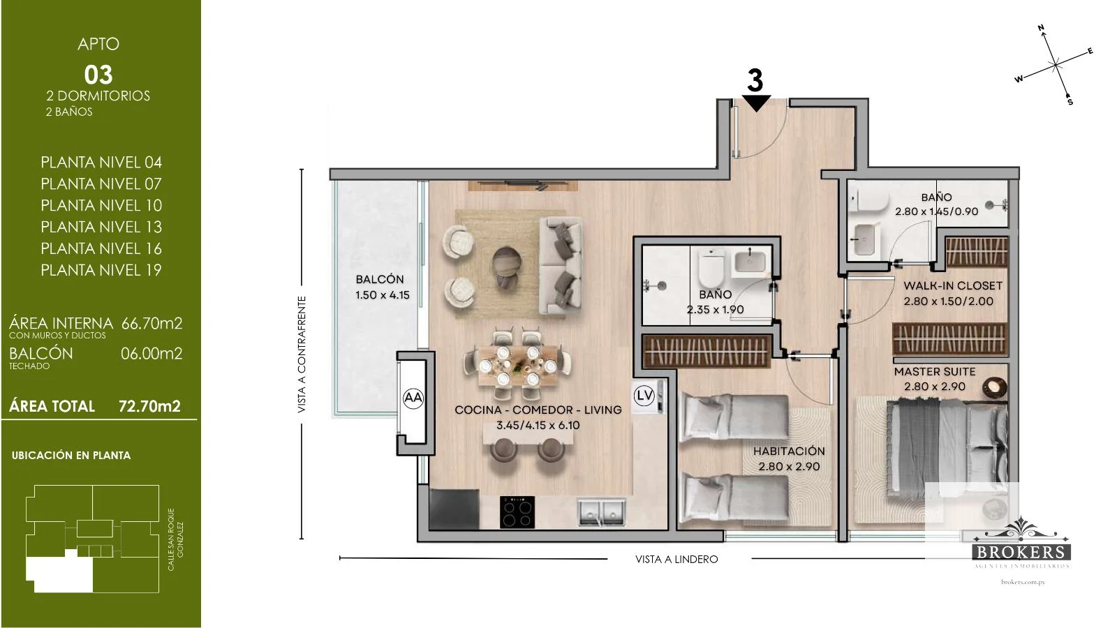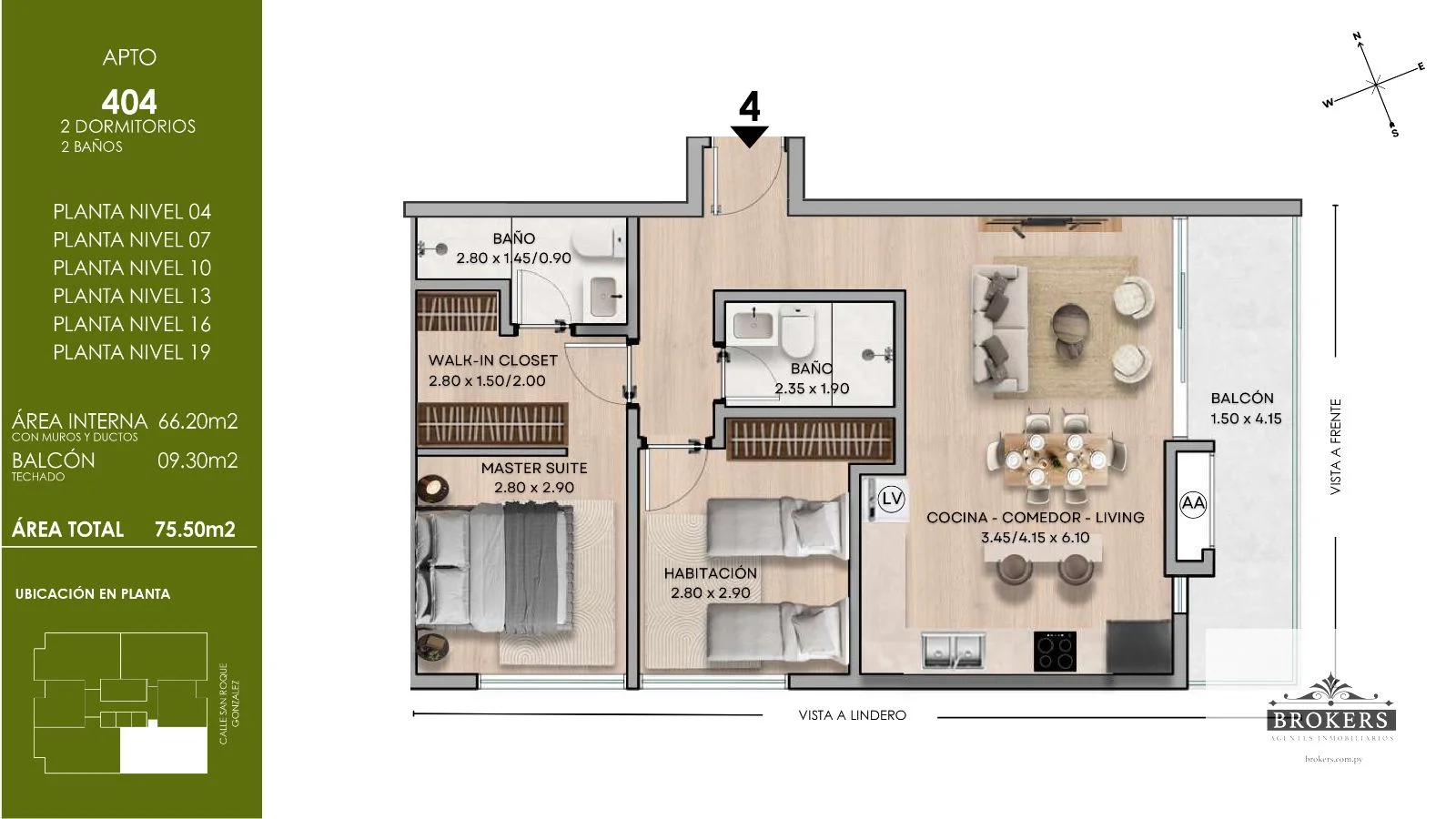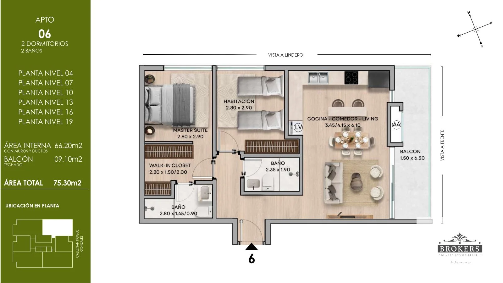 El Edificio Aurora presenta una oportunidad única de inversión con un departamento de 75,30 m² que redefine el concepto de calidad de vida en el corazón de la Recoleta, Asunción. Esta unidad destaca por su master suite, que incluye un walk-in closet y un baño en suite, además de una segunda habitación completa y un baño social. La cocina, el comedor y el living se integran en un diseño de planta abierta con aberturas de piso a techo, brindando una luminosidad excepcional y una conexión fluida con el balcón de 9,10 m², que ofrece vistas frontales.