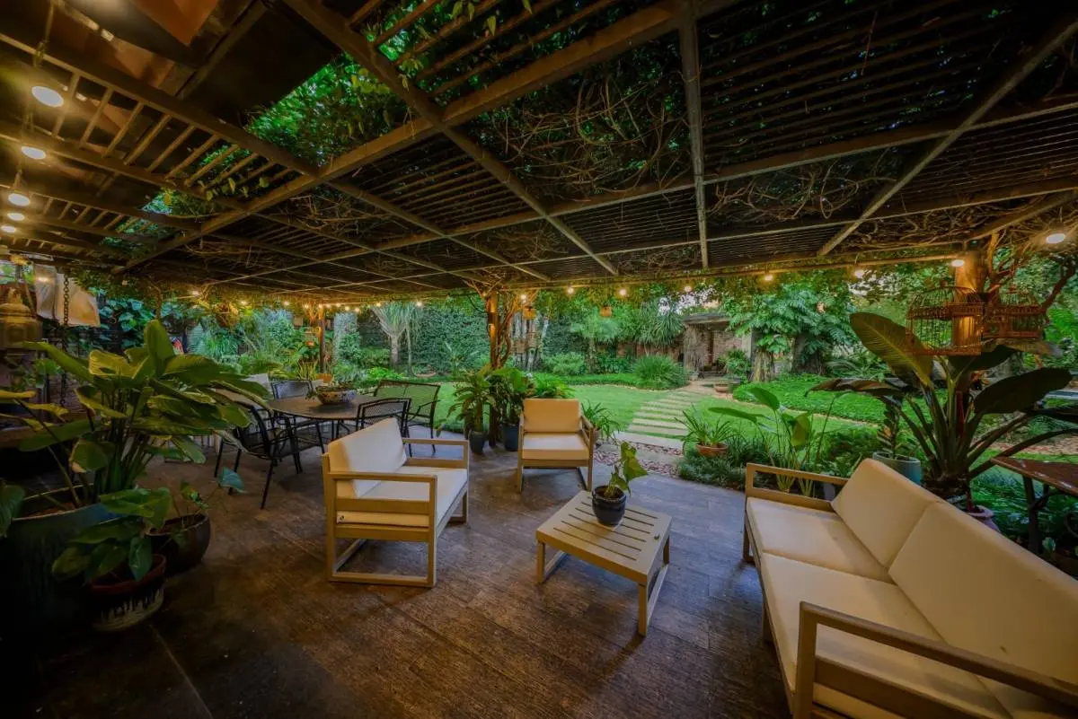 Jardín Privado: Amplio jardín parquizado con palmeras de gran porte, piscina de dimensiones generosas con detalle de cascada.
