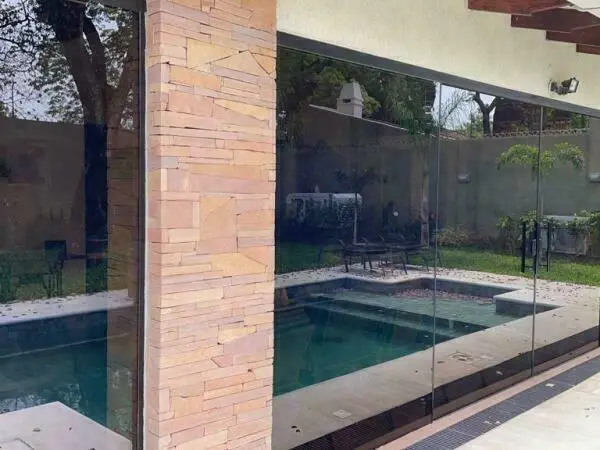 Detalles de pintura texturada y piedra rosada en varia zonas de la casa,