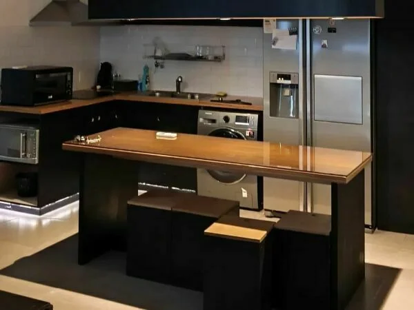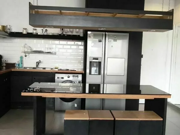 Cocina equipada (Heladera, anafe, extractor, horno eléctrico, microondas, cubiertos, vajillas, cafetera, mesada tipo barra, lavaropas)