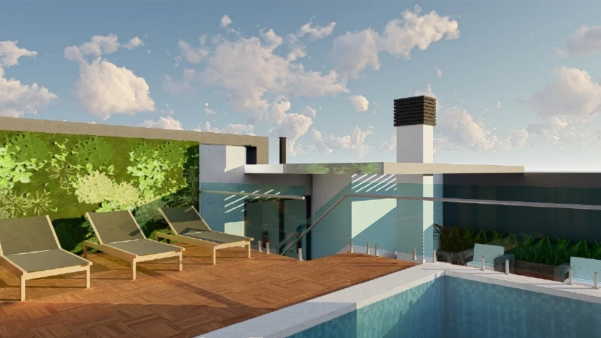 El Edificio SANTA MARÍA contará con 7 niveles de Departamentos, 2 niveles de estacionamientos y una terraza con amenities.