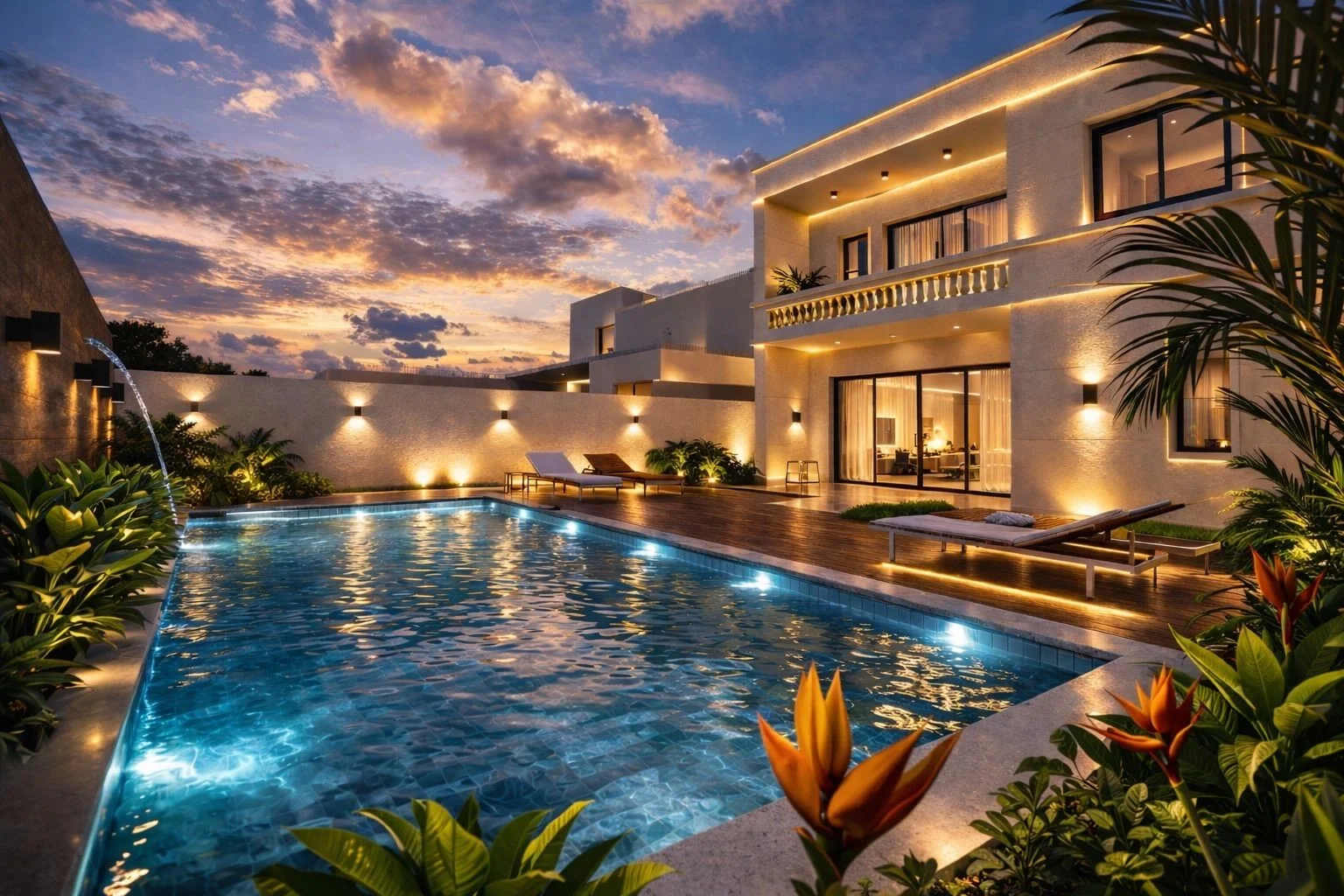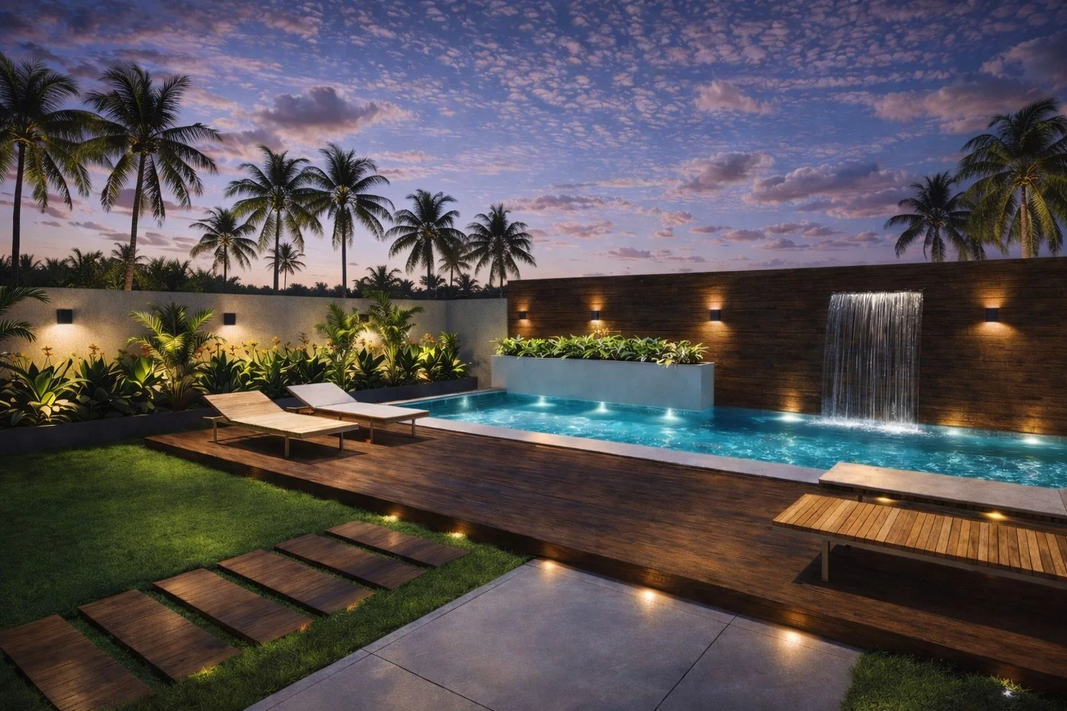 Amplio Jardín y piscina con cascada y baño de piscina.
