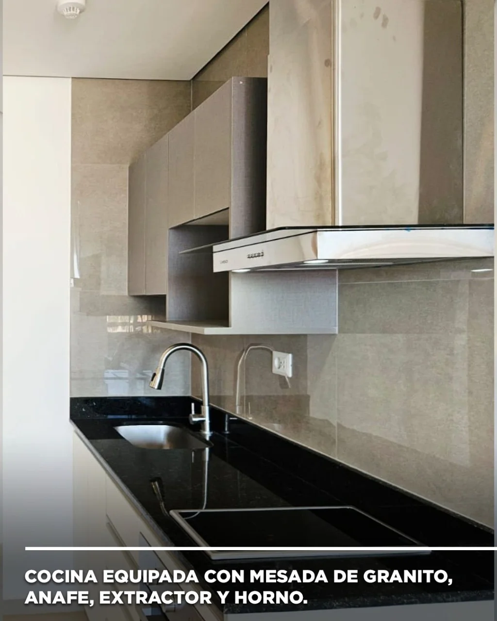 ????Horno, anafe y extractor instalados, mesada de granito en cocina.