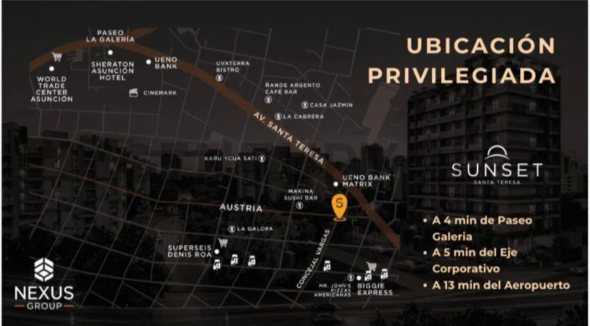 A metros de la Avda Santa Teresa y a 4 minutos del shopping del Sol y Paseo Galería | Polo de inversión de mayor crecimiento de Asunción a pasos de los principales colegios y universidades, a metros de numerosos negocios, bancos , restaurantes y cafeterías.