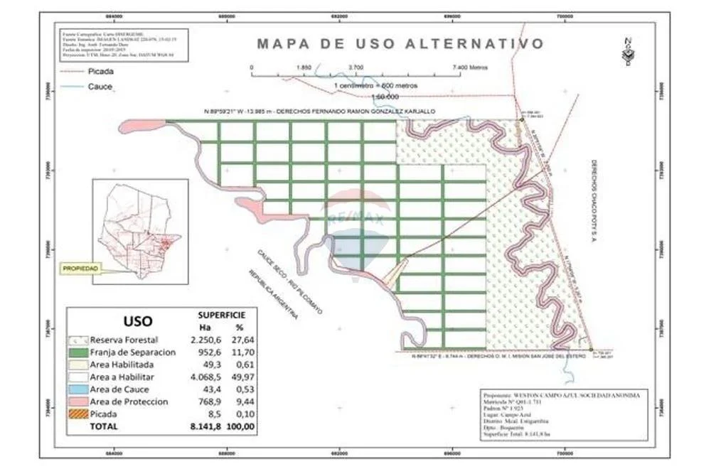 La propiedad cuenta con título, mensura judicial aprobada y licencia ambiental renovada por MADES e INFONA para actividad ganadera y producción de carbón. Con agua subterránea apta para consumo animal y potencial de bolsones de agua potable, el campo ofrece una aptitud ganadera y agrícola excepcional.