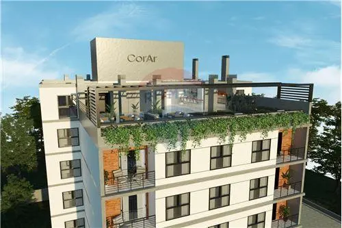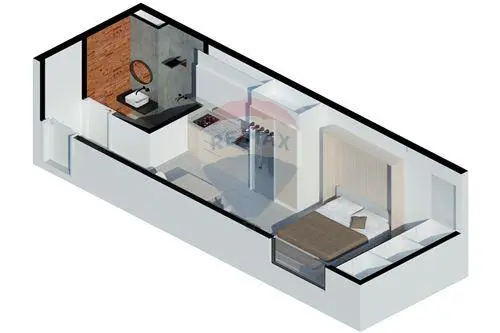 Monoambiente con balcón, 28.00 m2 propios y 34.00 m2 totales.