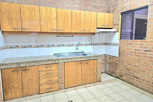 Cocina amoblada con muebles de madera y mesada de granito.