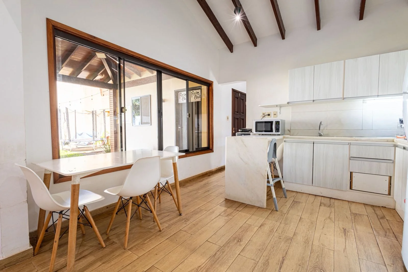 Sala, cocina, comedor integrados.