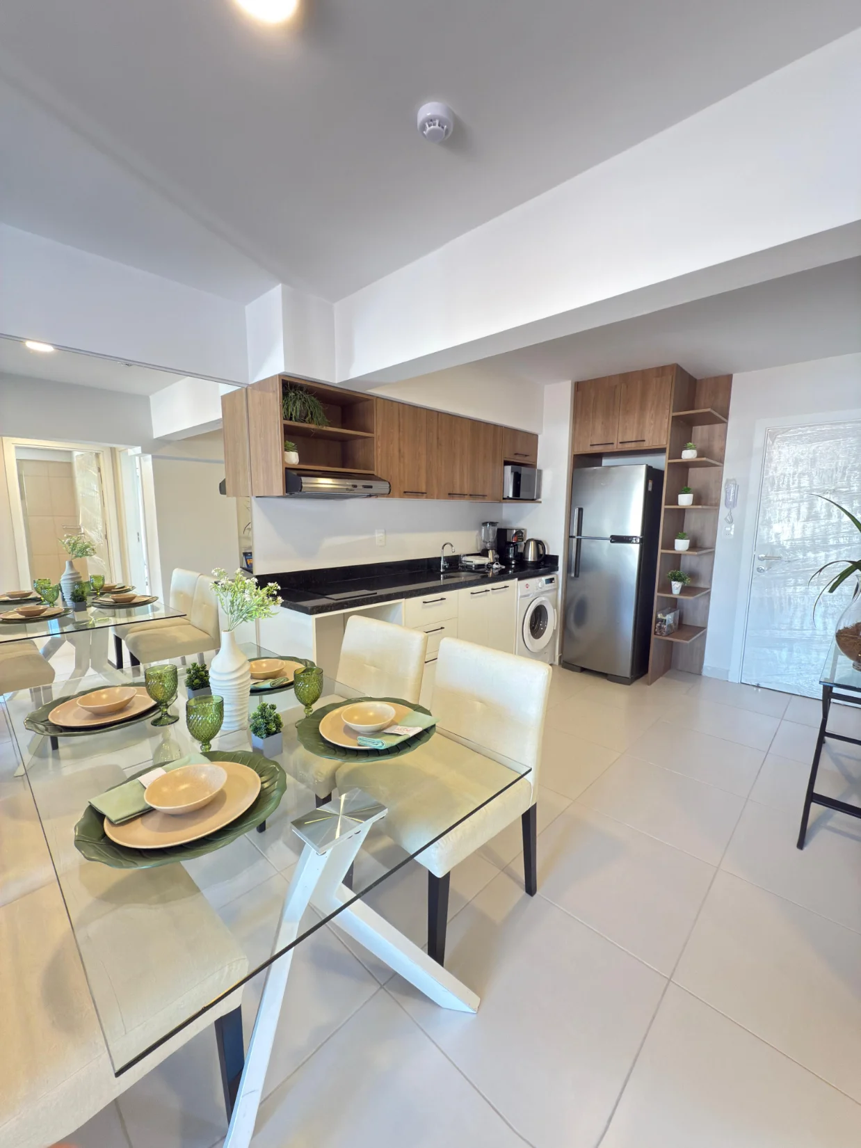 - Cocina/Comedor integrados, equipados con mesada de granito, anafe, y purificador. Muebles de cocina, bajo y sobre la mesada.