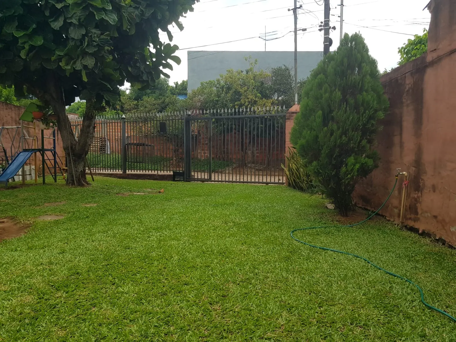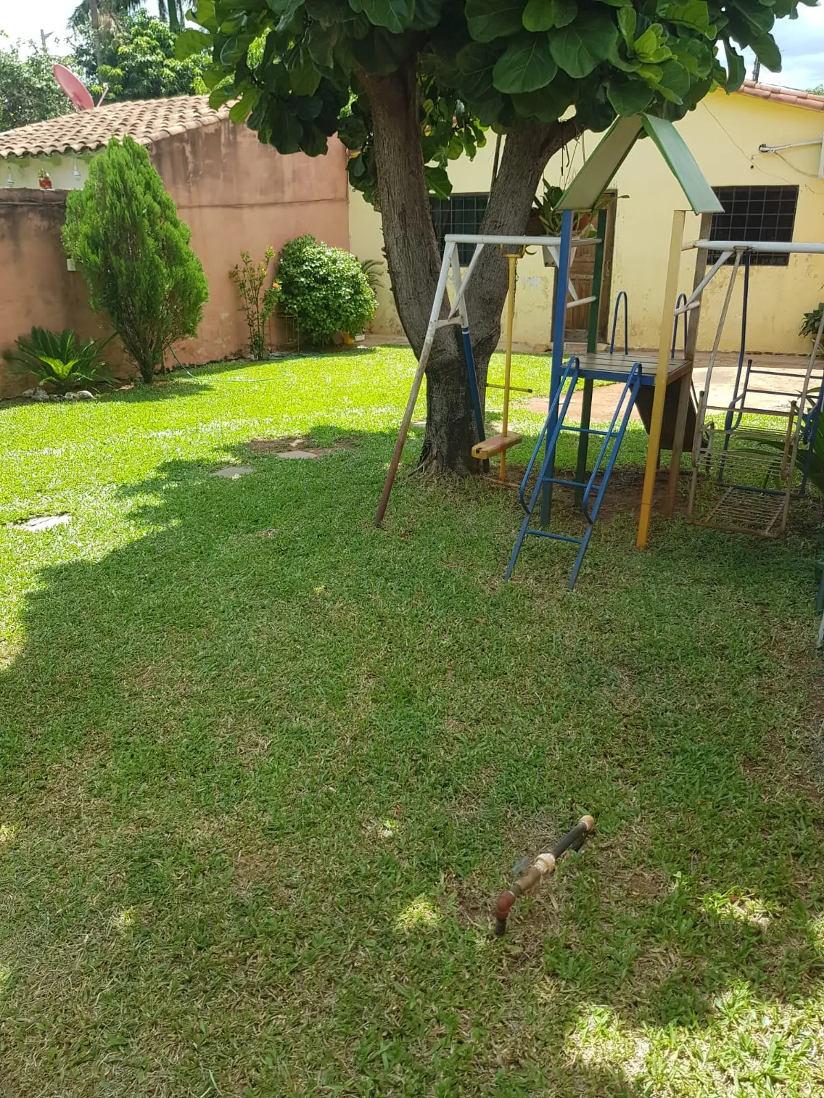 Amplio patio con pasto natural, árboles frutales, planta de sombra y pequeño parque infantil que permanece en caso de contar con niños.