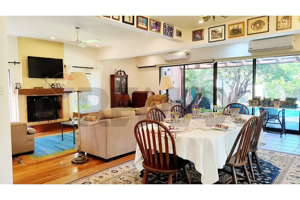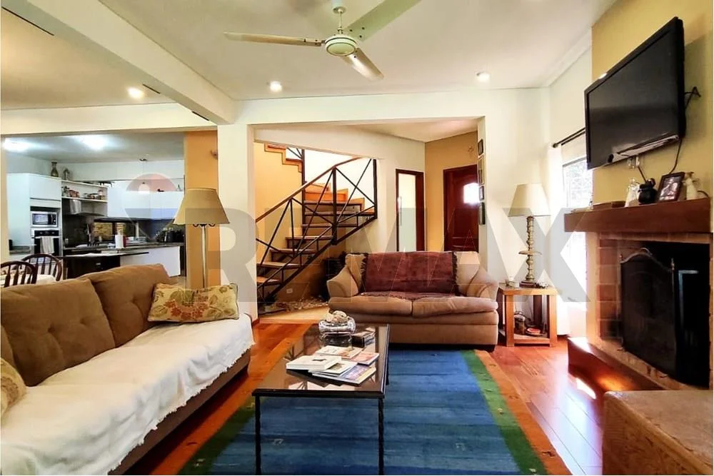 Amplio living con chimenea, luz natural y vista directa a la piscina.