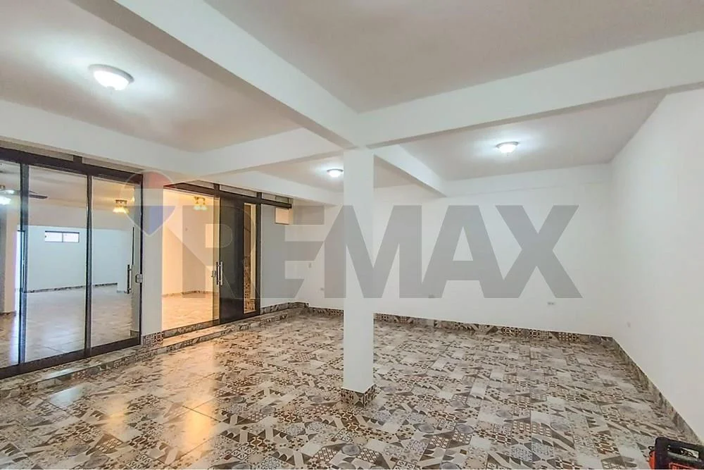 Quincho techado con parrilla rotativa y un baño. Todo el tercer piso con baranda.