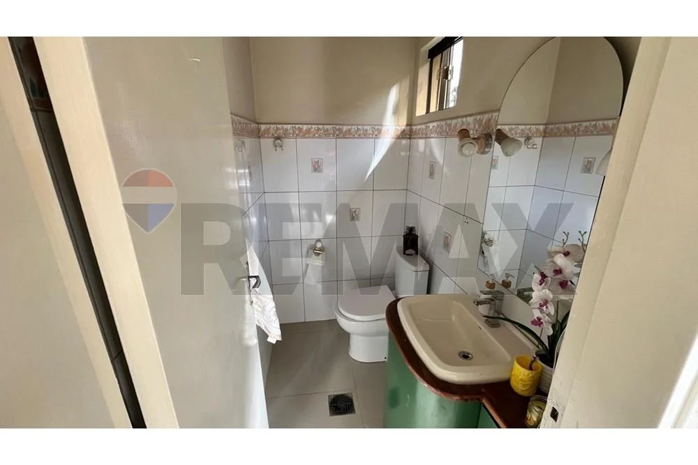 una oficina, baño social, sala recibidor, sala estar, comedor, cocina, área de servicio con baño, quincho climatizado, piscina y patio trasero. El estacionamiento tiene capacidad para hasta 3 vehículos.