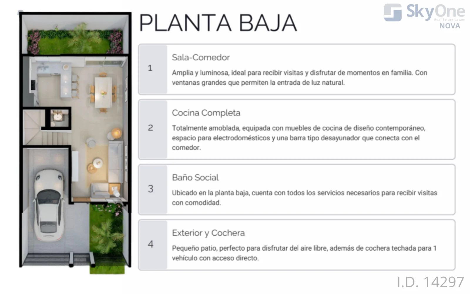 • Baño social, Cochera techada y Patio posterior privado.
