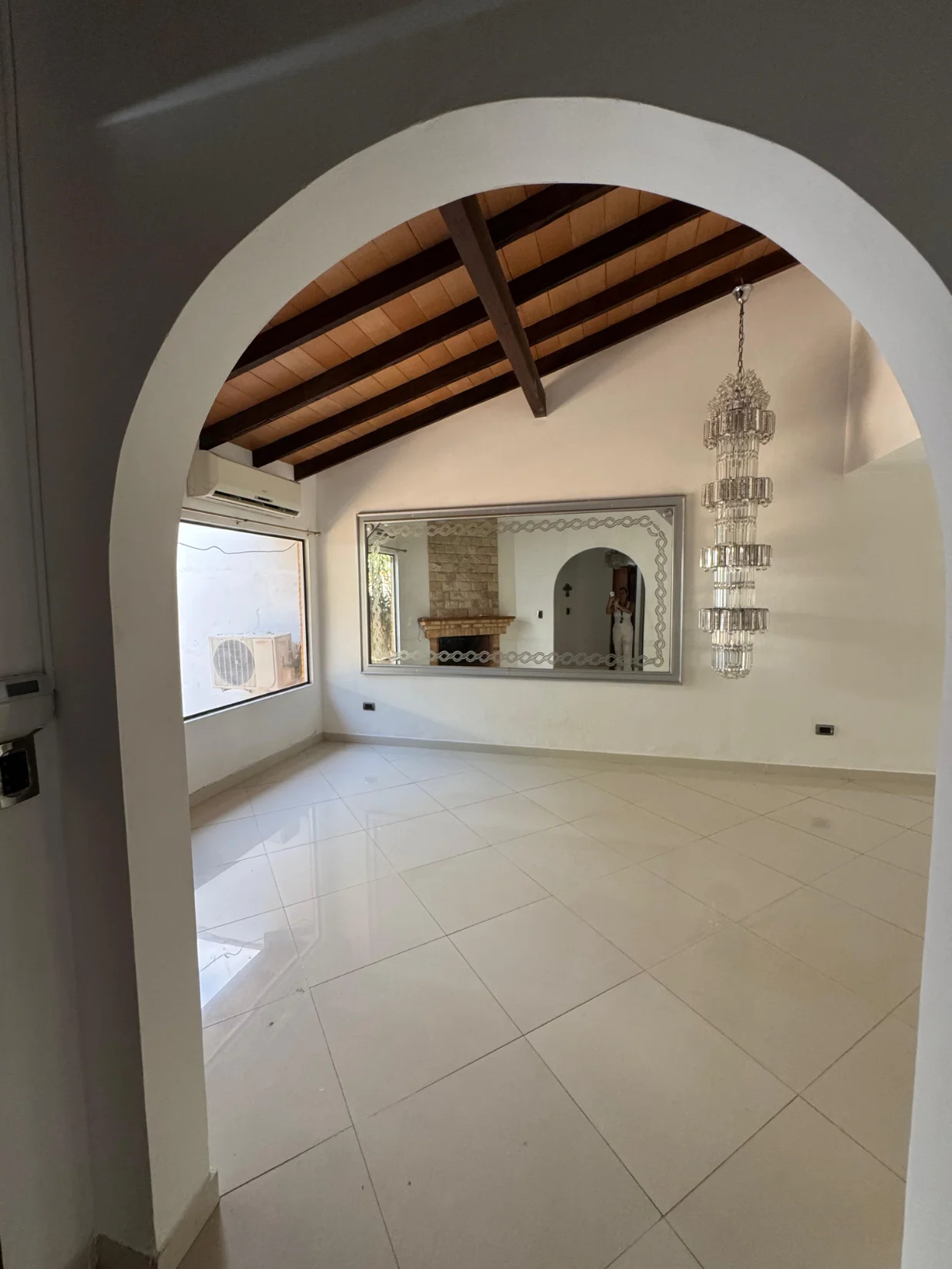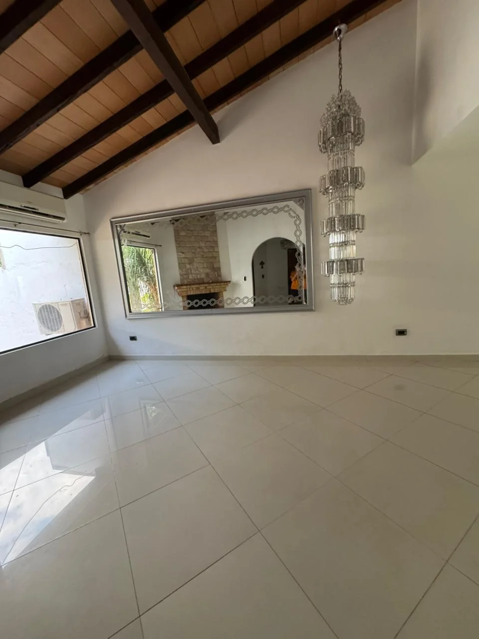 Sala con enorme araña de cristales y espejo incluido.