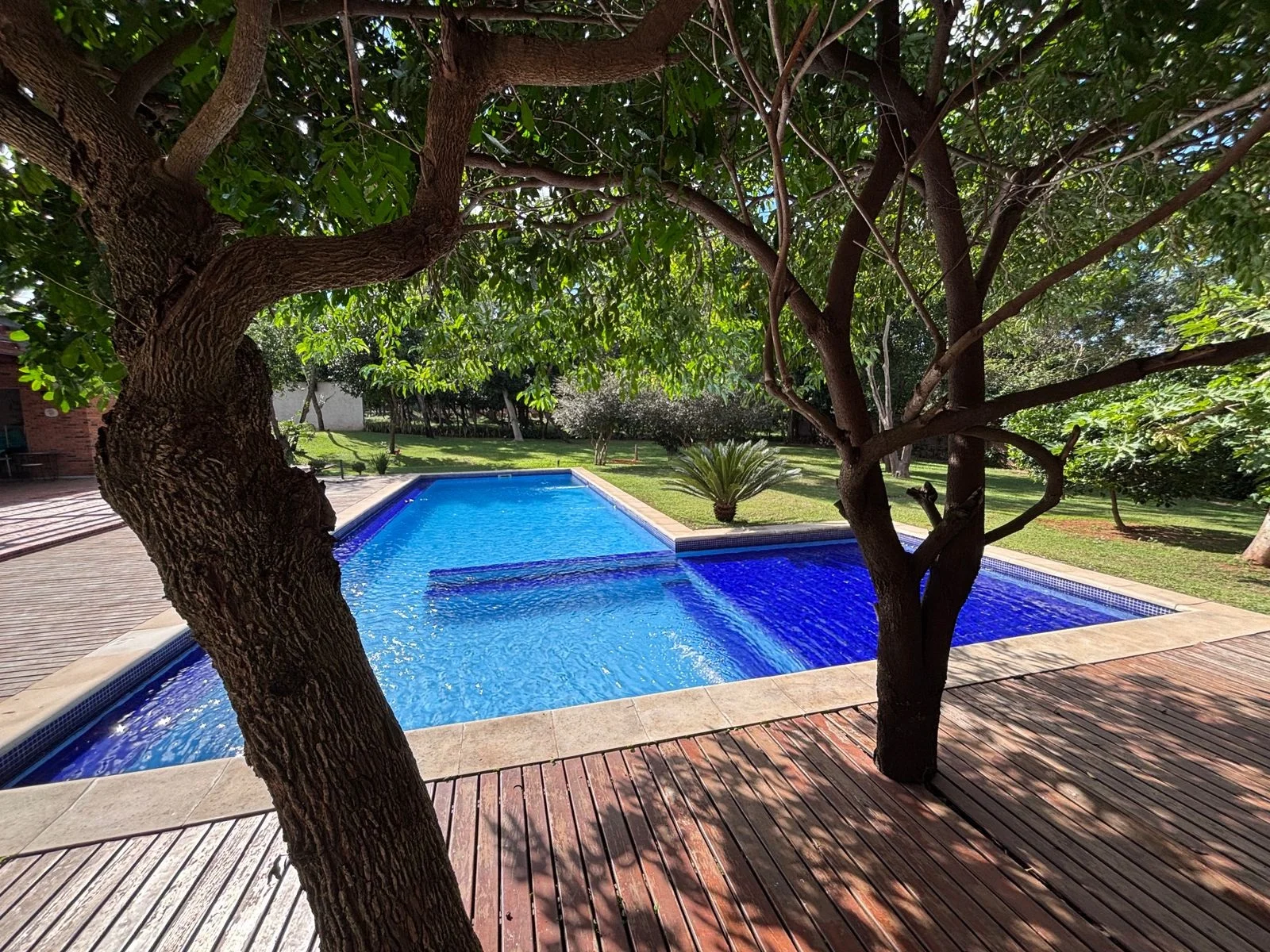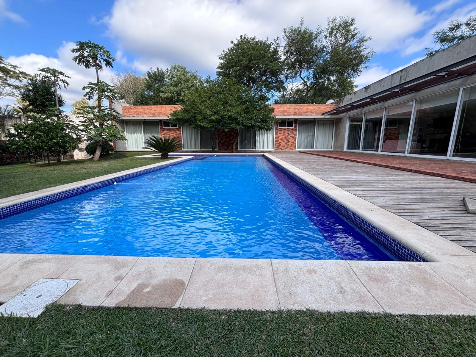 Piscina con vista al gran y hermoso jardín con césped natural