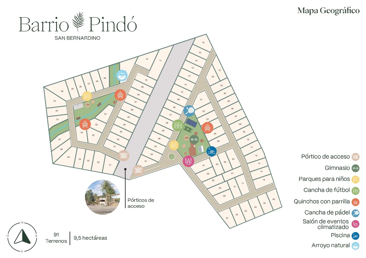 Barrio Pindó es un exclusivo barrio cerrado en San Bernardino que ofrece lotes amplios desde 706 m², rodeados de naturaleza y ubicados a solo 1 km de la ruta principal. Es ideal tanto para vivienda permanente como para casa de verano, gracias a su cercanía con lagos, playas y un entorno verde de 9,5 hectáreas.