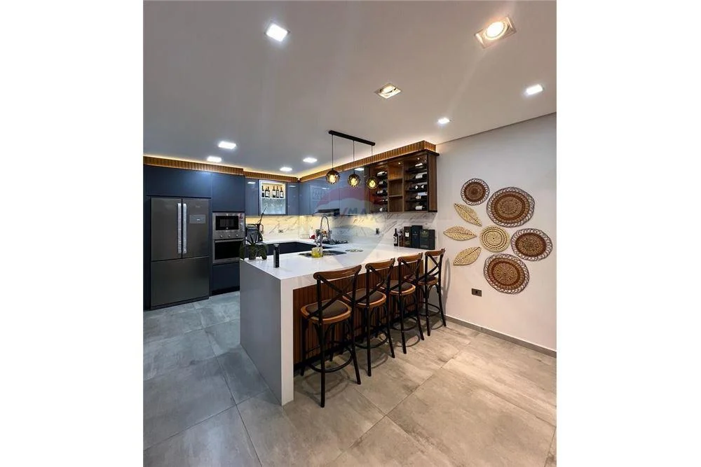 -Cocina con desayunador de cuarzolito, equipado con horno, anafe, extractor, microondas, heladera de tres puertas, lavavajillas.