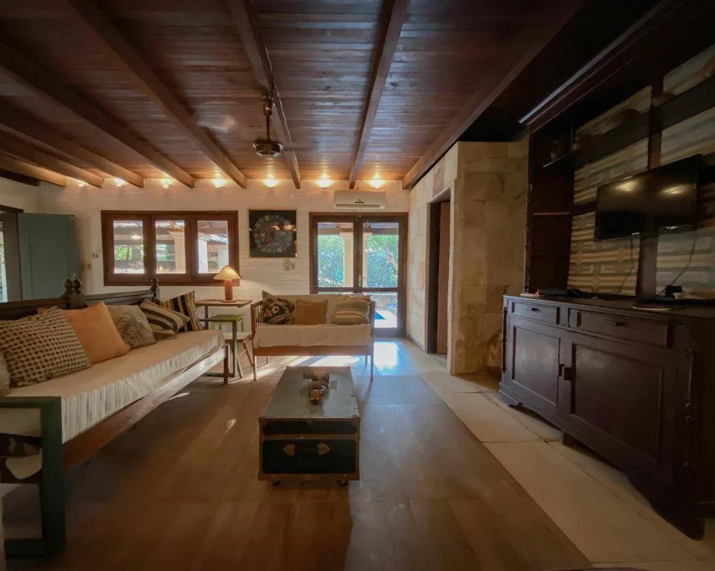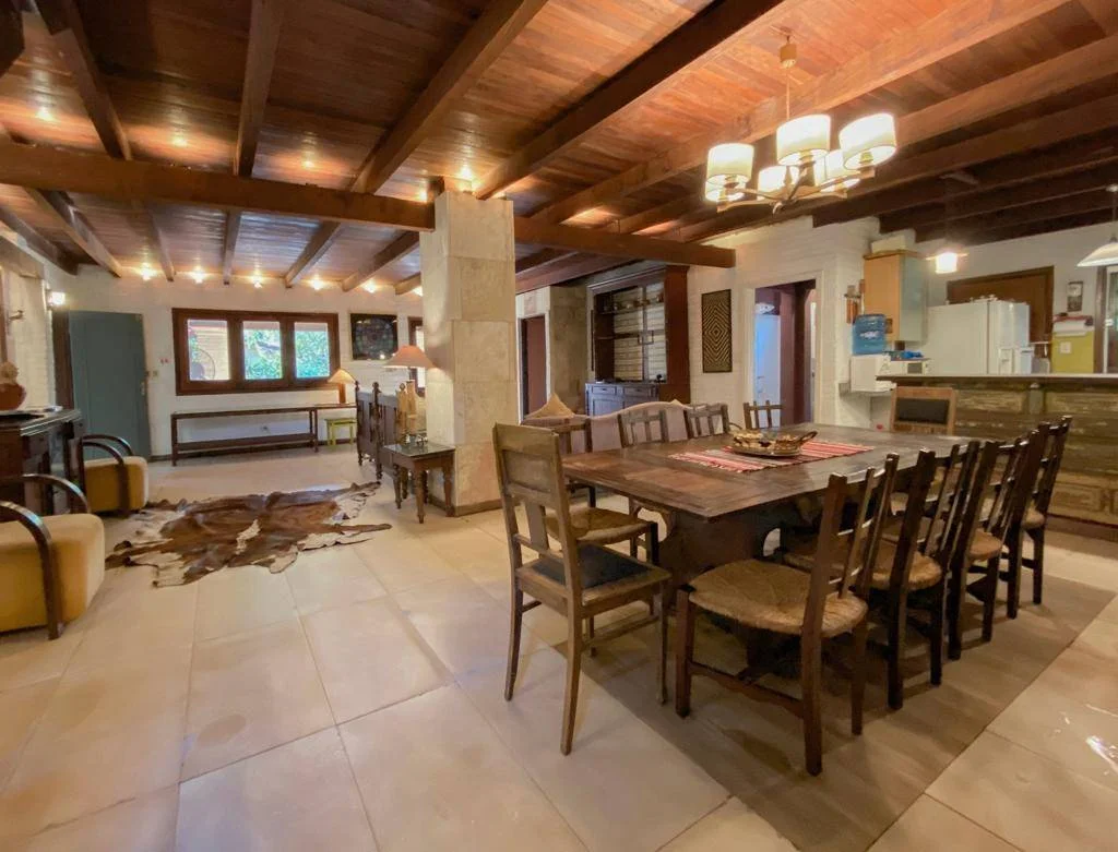 Quincho abierto con área de deck y piscina