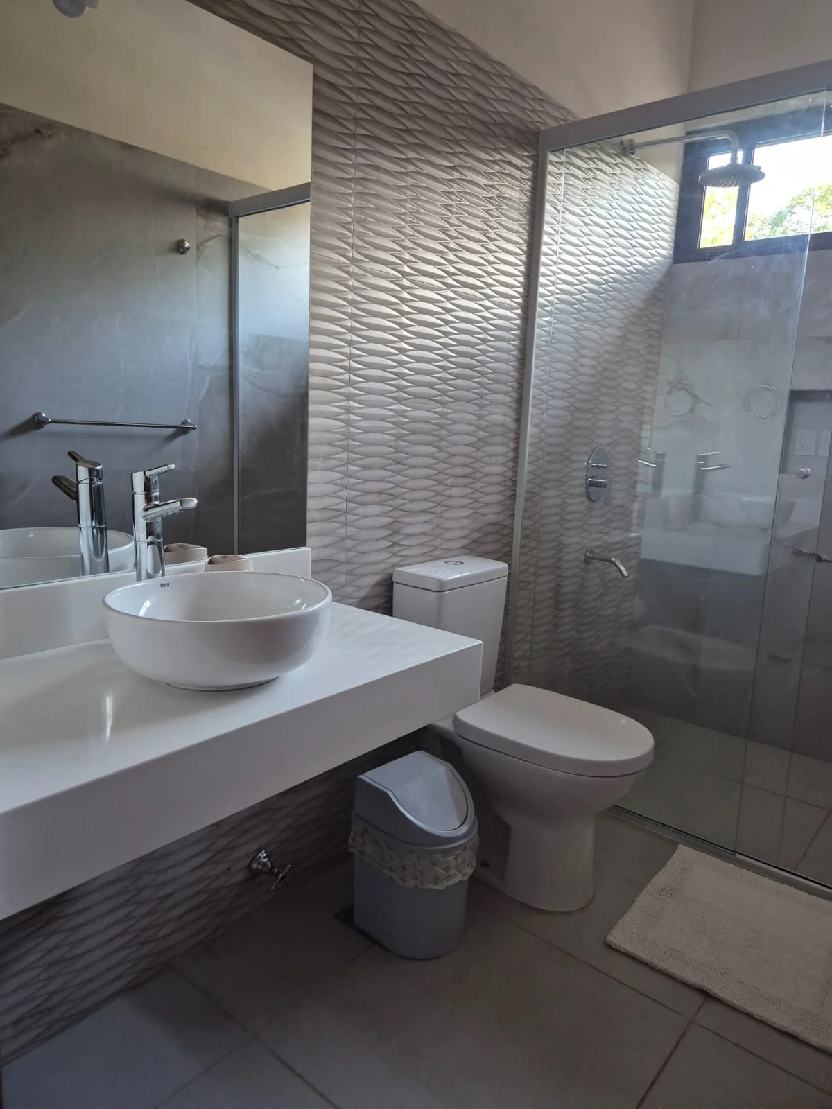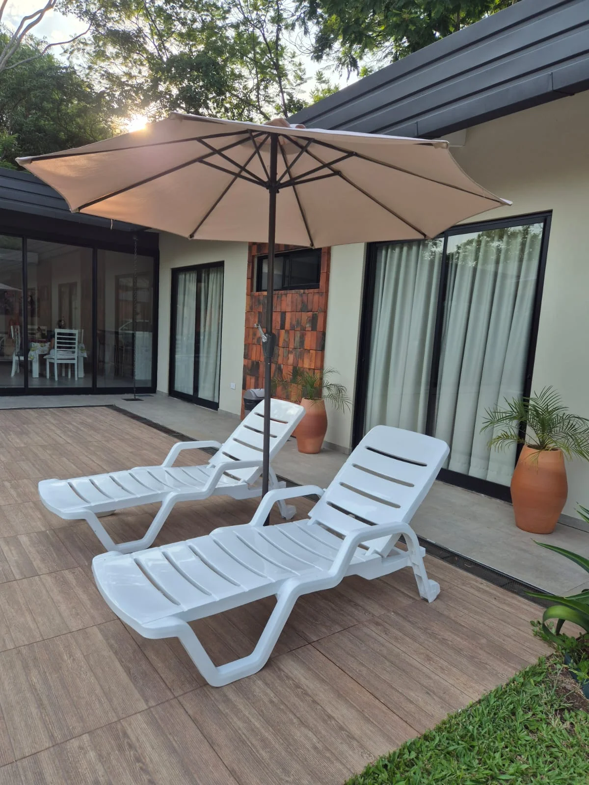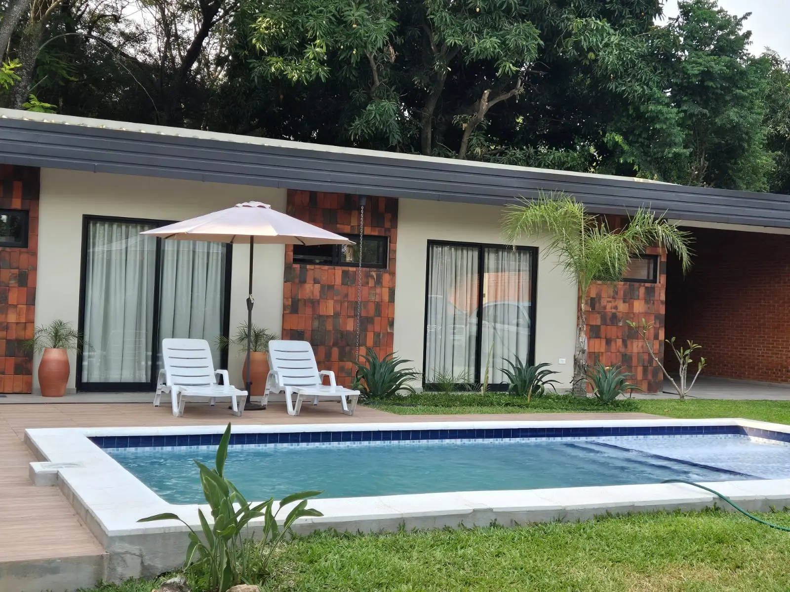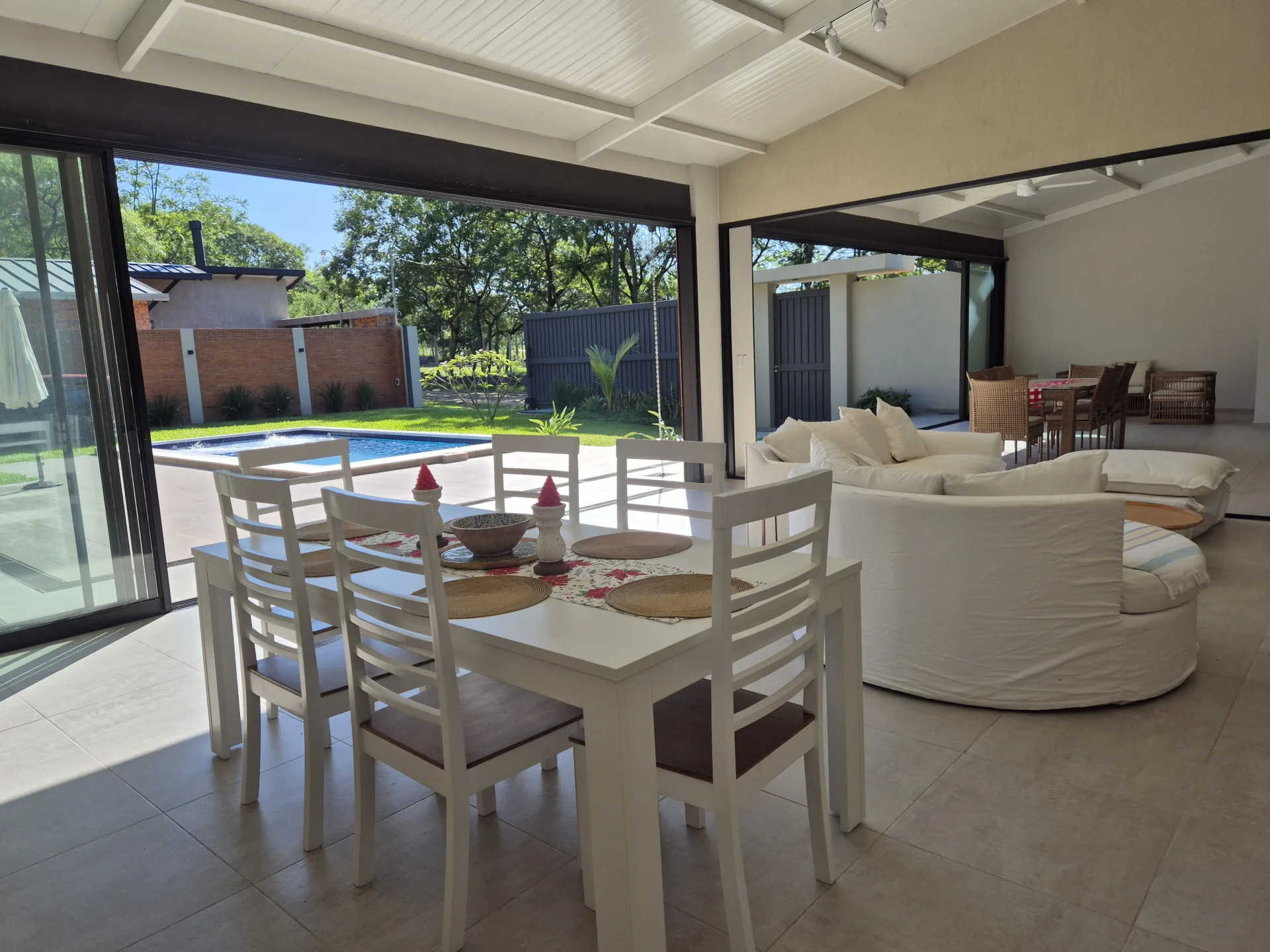 vivienda es nueva a estrenar, cuenta con 3 dormitorios en suite con cortinas blackout, cocina amoblada con desayunador de granito está integrada con la sala comedor con chimenea, area de parrilla con 150mts de espacio baño social, area de servicio, con tendedero, piscina con solarium, area de sillas y garage, portón automatizado, todas las áreas climatizadas y blindex para una relación visual interior y exterior.