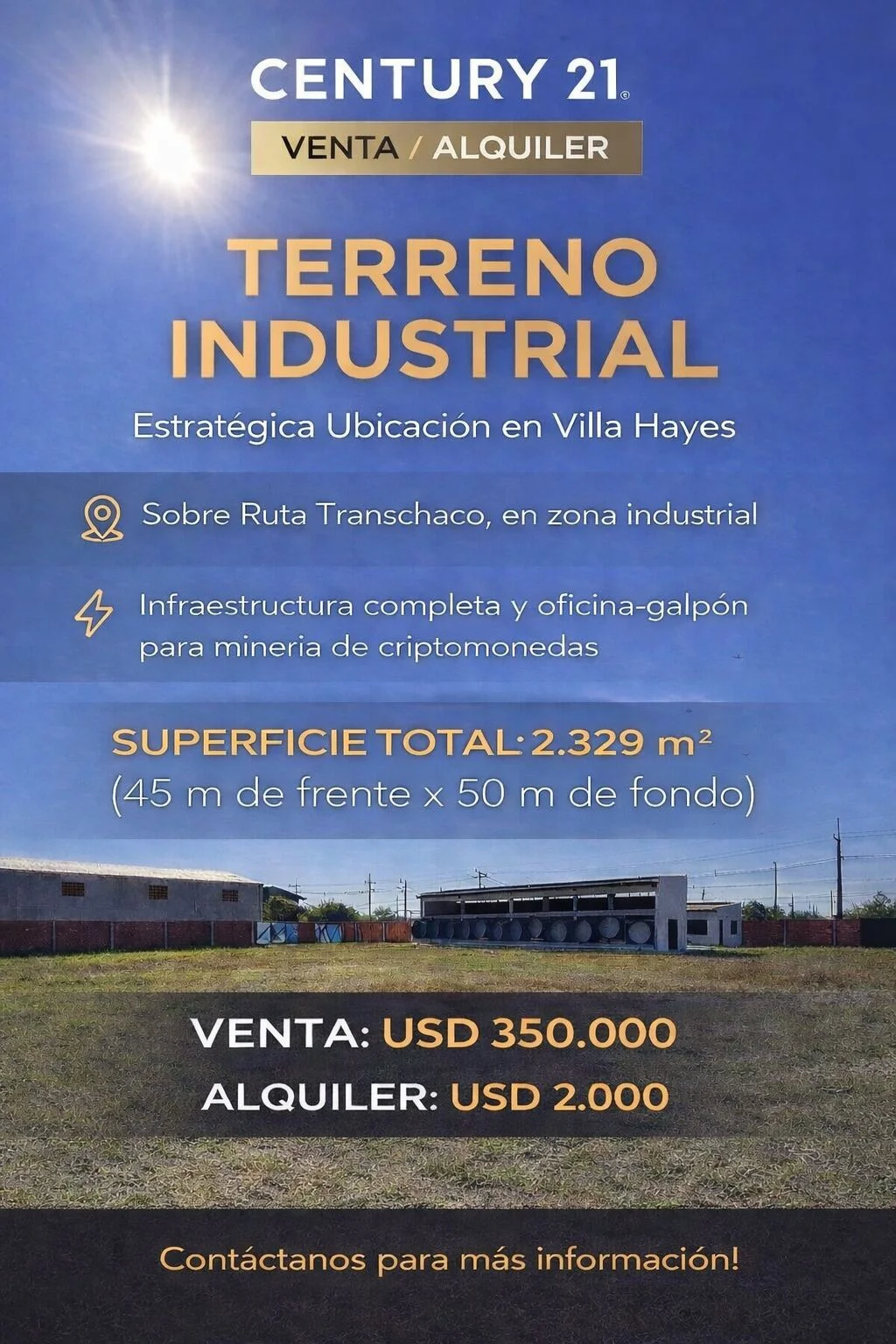 Cuenta con oficinas y galpón preparado para operación de minería de criptomonedas