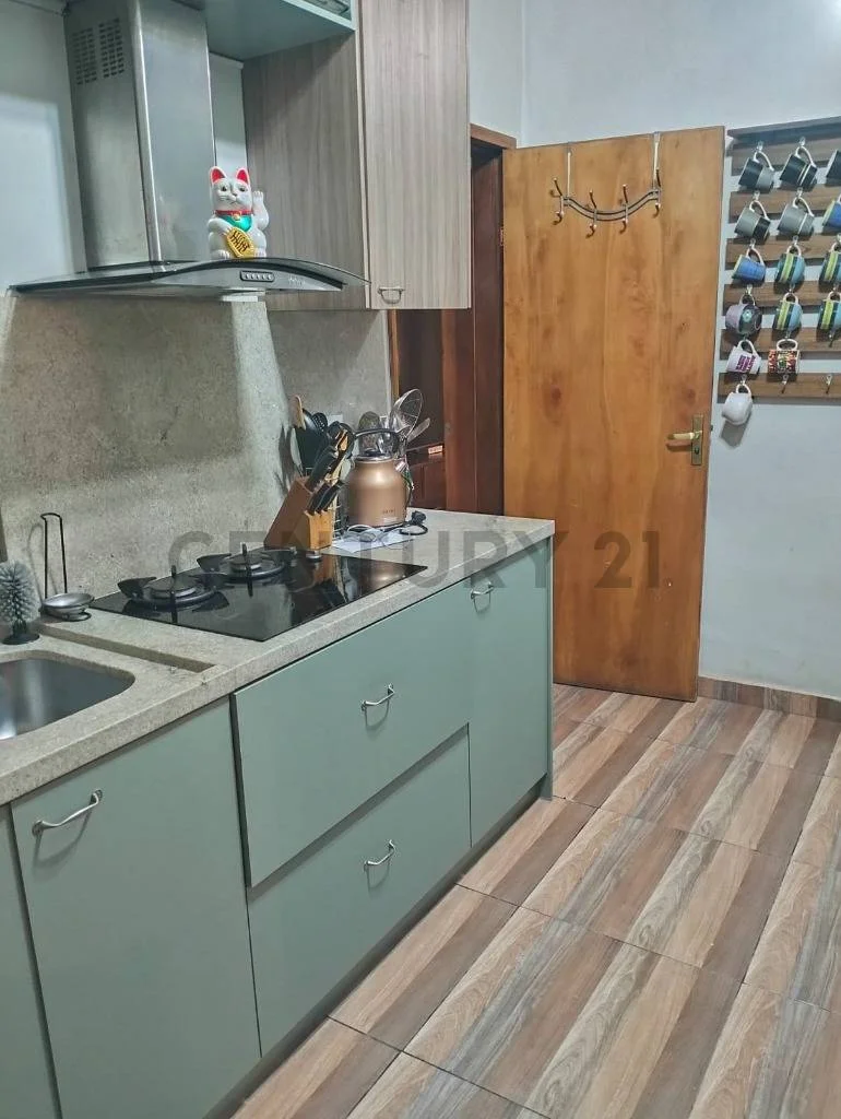 Cocina amoblada con muebles inferiores, superiores, y barra de desayuno.