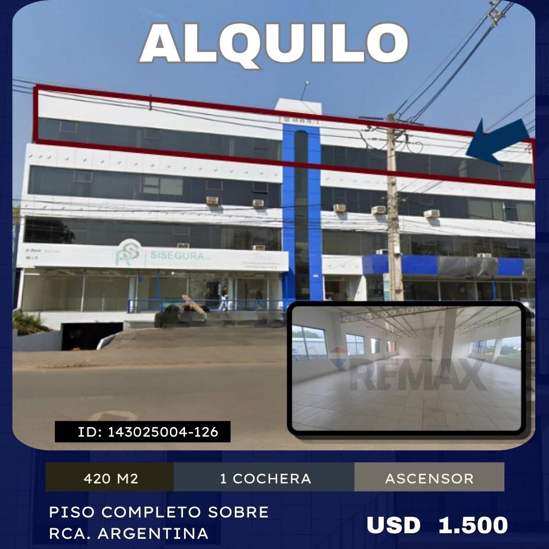*ALQUILO OFICINA CORPORATIVA SOBRE AVDA. RCA. ARGENTINA* Amplia y luminosa oficina de 420 m², con vista panorámica ubicada estratégicamente sobre la Avda. República Argentina, a 200 de la Avda. Eusebio Ayala, una de las principales arterias comerciales de la ciudad de Asunción, con fácil acceso y gran visibilidad. Situada en el tercer piso, esta oficina ofrece un espacio amplio, funcional y luminoso, ideal para empresas, estudios profesionales, consultorios, call centers o centros administrativos. Cuenta con: 4 baños sexados 1 cochera Ascensor Una excelente oportunidad para establecer tu empresa en una ubicación estratégica, segura y de alto perfil comercial. Agenda tu visita al ?