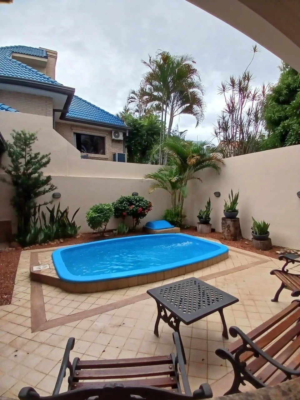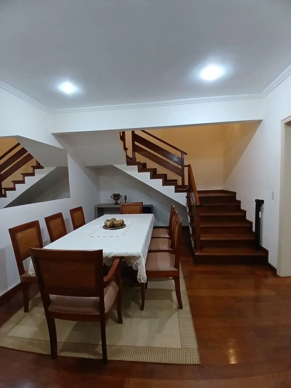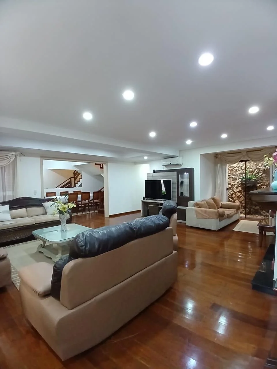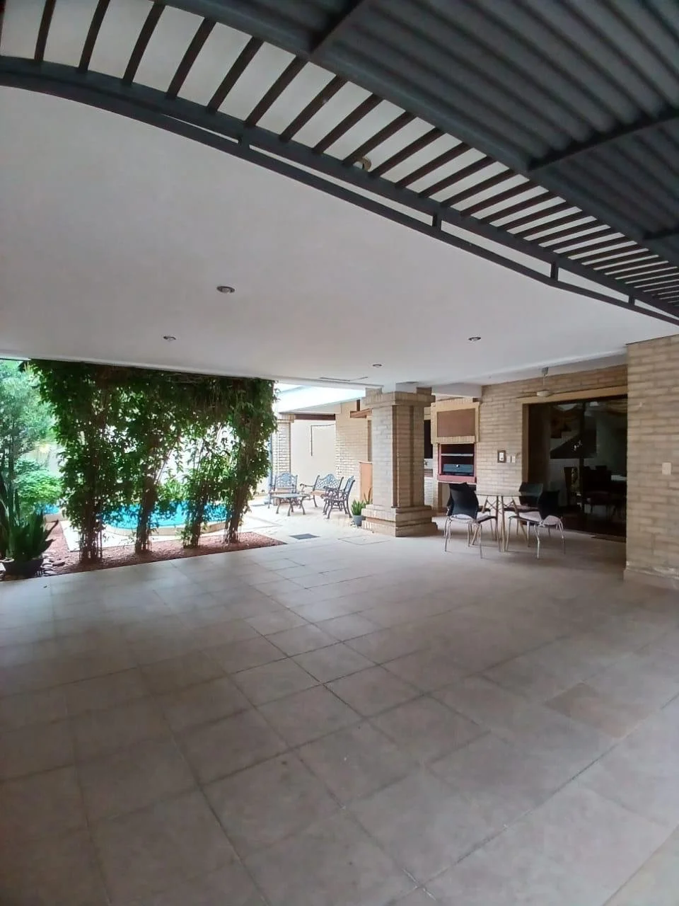 PLANTA BAJA▫️Sala con chimenea, buena distribución, piso parquet, muebles, tv.▫️Patio interno decorativo.▫️ Comedor, mesa de madera masiza con sillas.▫️ Cocina amoblada y equipada.▫️Baño social▫️ Área de servicio ( dormitorio, baño)▫️Quincho equipado▫️ Lavadero▫️ Piscina con cerco protector.▫️ Estacionamiento para 2 vehículos