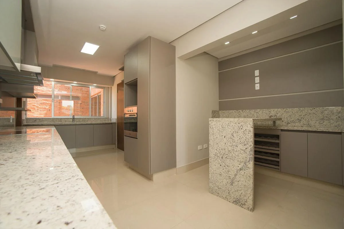 El departamento cuenta con tres dormitorios, uno en suite, 4 baños, sala comedor, cocina amoblada, estar, escritorio mas gimnasio con caminadora, Amplio balcón, área de servicio, cochera para dos vehículos.
