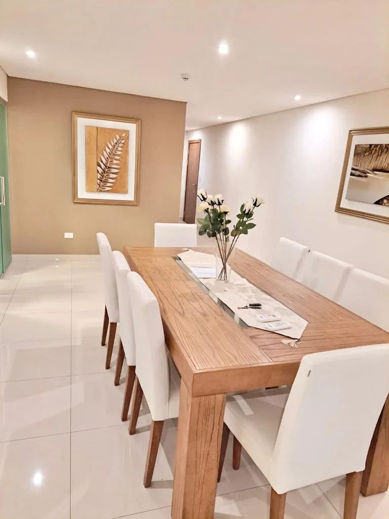 El departamento cuenta con 197m², tres habitaciones todas equipadas con aires acondicionados, camas, placares, sala, comedor, amplio balcón, cocina equipada con lavavajillas, horno, heladera, microondas lavarropas, cubiertos y vajillerias en general, área de servicios con cama, baño propio.