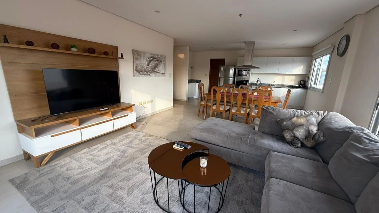 - Amplio estar comedor con aire acondicionado, amoblado con mesa comedor y 8 sillas, living, rack de tv, cortinas roller en todos los ventanales.
